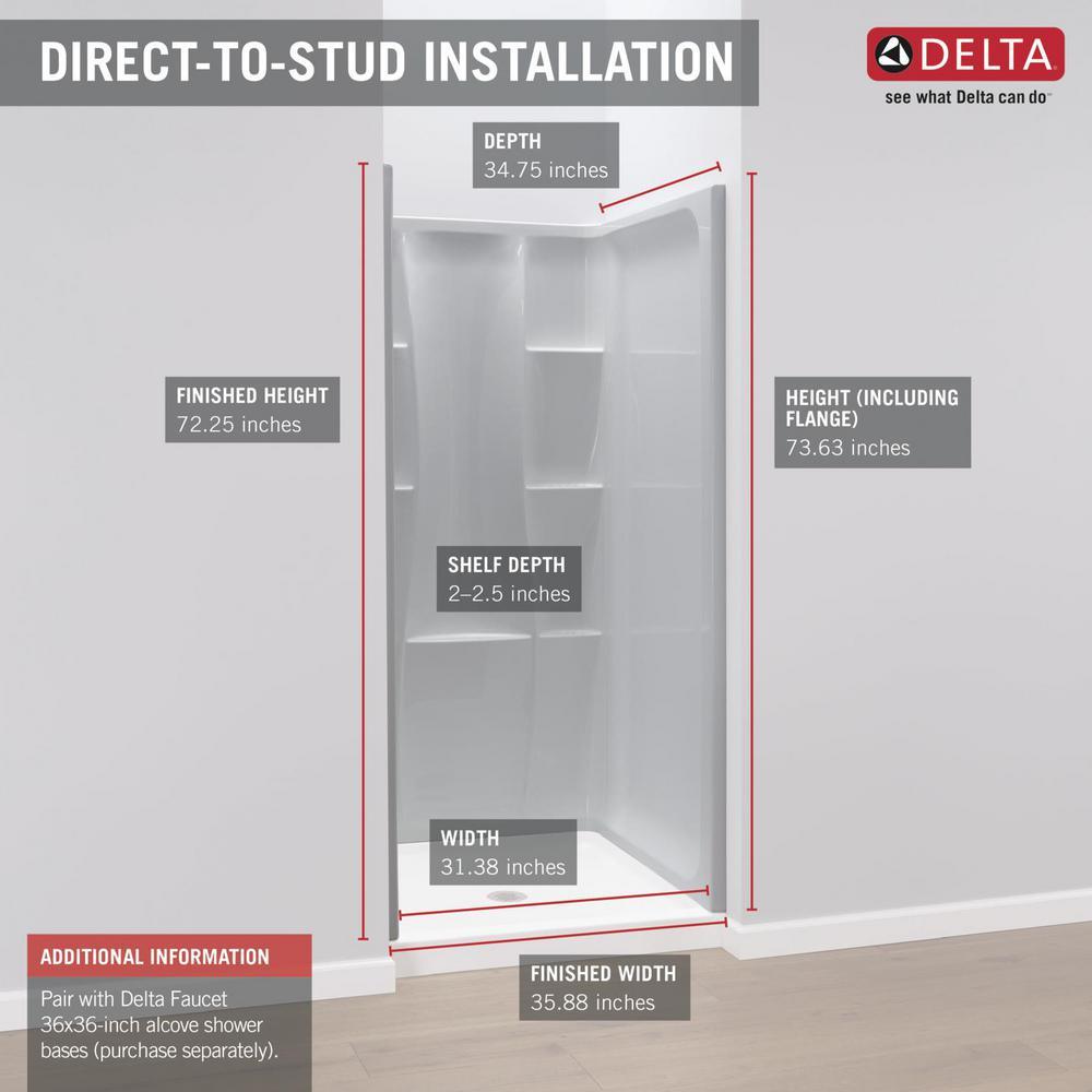 The Classic 400 36 in. x 36 in. x 74 in. 3-Piece Direct-to-Stud Shower Wall Surround in White offers durability and style for your bath. This shower wall set offers an attractive design with the strength and durability of acrylic. This wall set also features six corner shelves and one center shelf for maximum storage. Classic 400 bathing systems offer style and design with the strength and durability of acrylic material. ProCrylic is a durable, bright white, high-gloss acrylic that provides all of the benefits of acrylic without the need for the rough, abrasive fiberglass backing.