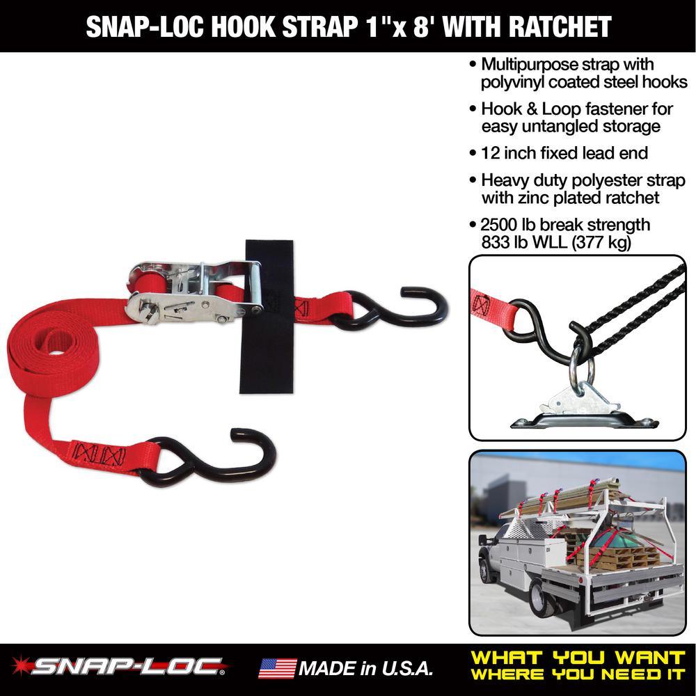 This S-Hook strap will outlast and outperform any cheap import strap! Includes 12 in. lead end with heavy duty torque ratchet, 8 foot overall length, S-Hook ends and sewn on Hook and Loop fastener for easy storage. Strap has an enormous 2500 lb. break strength, 833 lb. working load and is made from long lasting heavy duty polyester webbing. SNAP-LOC also offers a variety of System Accessories and other Straps for most every type of application. SNAP-LOC is Ultimate Cargo Control.
