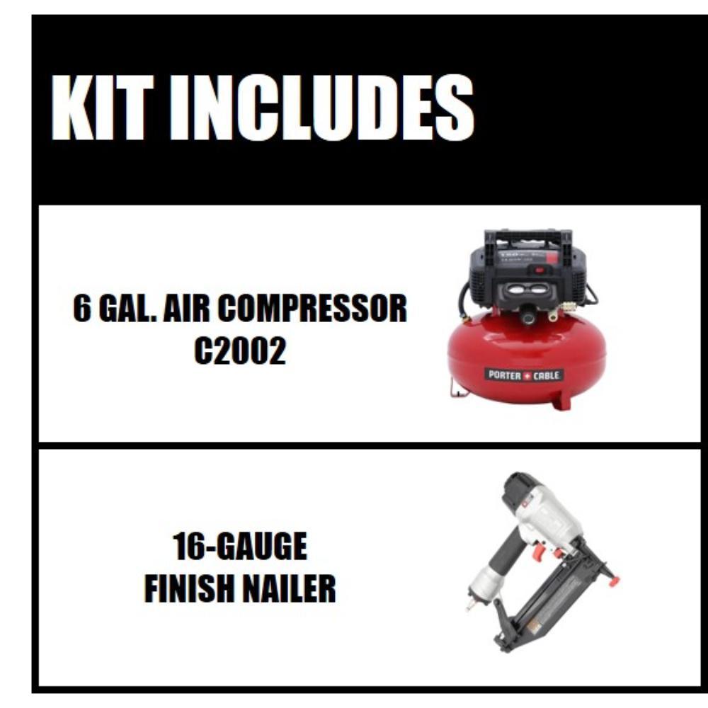 A range of tools make this combo kit ideal for crown molding, staircases and interior trim work. It includes a C2002 6 gal. tank, 150 PSI compressor, FN250SB: 16-Gauge 2-1/2 in. finish nailer, 25 ft. of 1/4 in. air hose with a coupler and plug, 2 in. length finish nails and belt hook accessory. The compressor can easily support two users with a pair of regulated, factory-installed air couplers. Its body is made with steel for strength, and the upgraded shroud and console cover protect its vital components for additional durability and portability. Say goodbye to maintenance with the oil-free pump feature. The tank operates at 150 max psi.