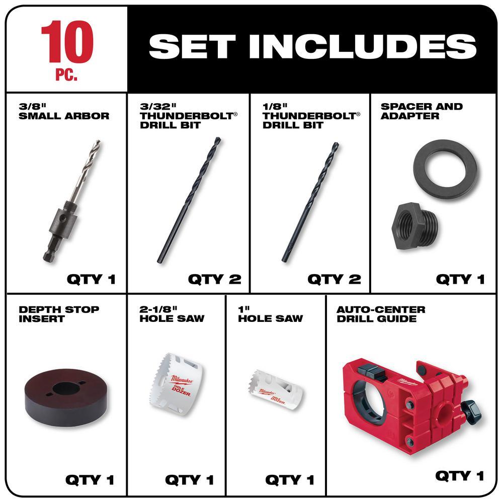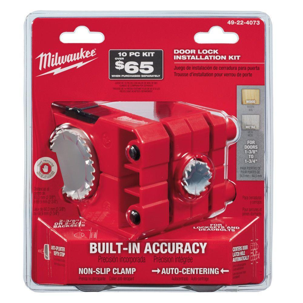 Save time and frustration when installing locksets and deadbolts with the MILWAUKEE Bi-Metal HOLE DOZER Door Lock Installation Kit. The hole saw installation kit was designed with accuracy and ease of use in mind, making it simple to align and drill holes in slab doors. The door lock installation kit is ideal for remodeling, replacing a damaged door or adding a deadbolt. The auto-centering guide and anti-splinter depth stop allow for centered holes with a clean finish every time. The hole saws feature RIP GUARD teeth built with more steel behind the cutting edge for added strength. The teeth give increased productivity on the job site and better hole quality. They are also backed by a limited lifetime tooth break warranty. Each HOLE DOZER is coated with a low friction, thermoset paint that provides a faster cutting speed in wood and more holes cut per battery charge. The hole saw kit comes with a Plug Jack featuring an all access slot design that allows for full access during plug removal. The Plug Jack enables access into the cup for both thick thin material removal, eliminating wasted downtime between holes. The versatile hole saw kit can be used on wood and metal interior and exterior doors that are between 1-3/8 in. to 1-3/4 in. thick.