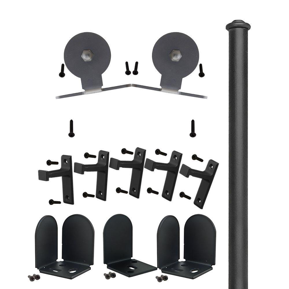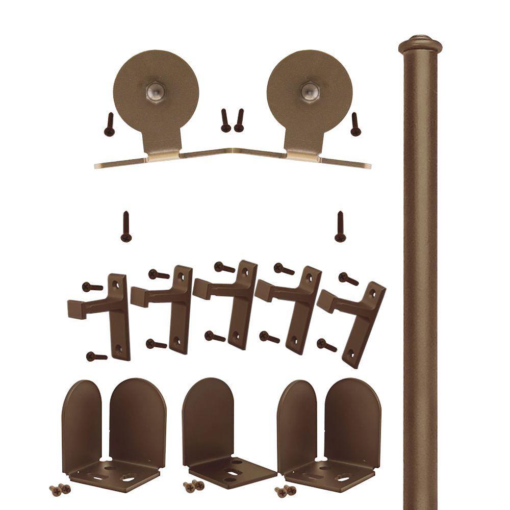 Now is your opportunity to make your home stand out from the crowd with Quiet Glide™ sliding door hardware. The Quiet Glide™ sliding door hardware will work with virtually any door style and be easily mounted to the wall in new construction or remodeling projects. The hardware kit has a durable powdered coat finish that contains 2 designer door rollers with thermoplastic wheels for a smooth and quiet rolling effect, One 72 in. solid aluminum rail, 5 vertical brackets to attach the rail to the wall, 1 pair of metal end caps to provide a finished look, 1 pair of metal center floor guides, 1 pair of designer metal floor door stops and all the hardware fasteners to assemble the barn door hardware to the door. (Door not included).