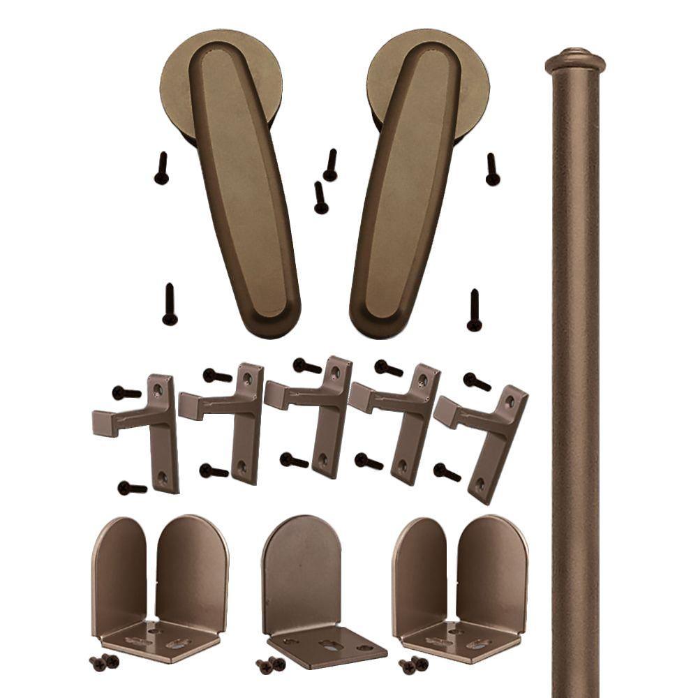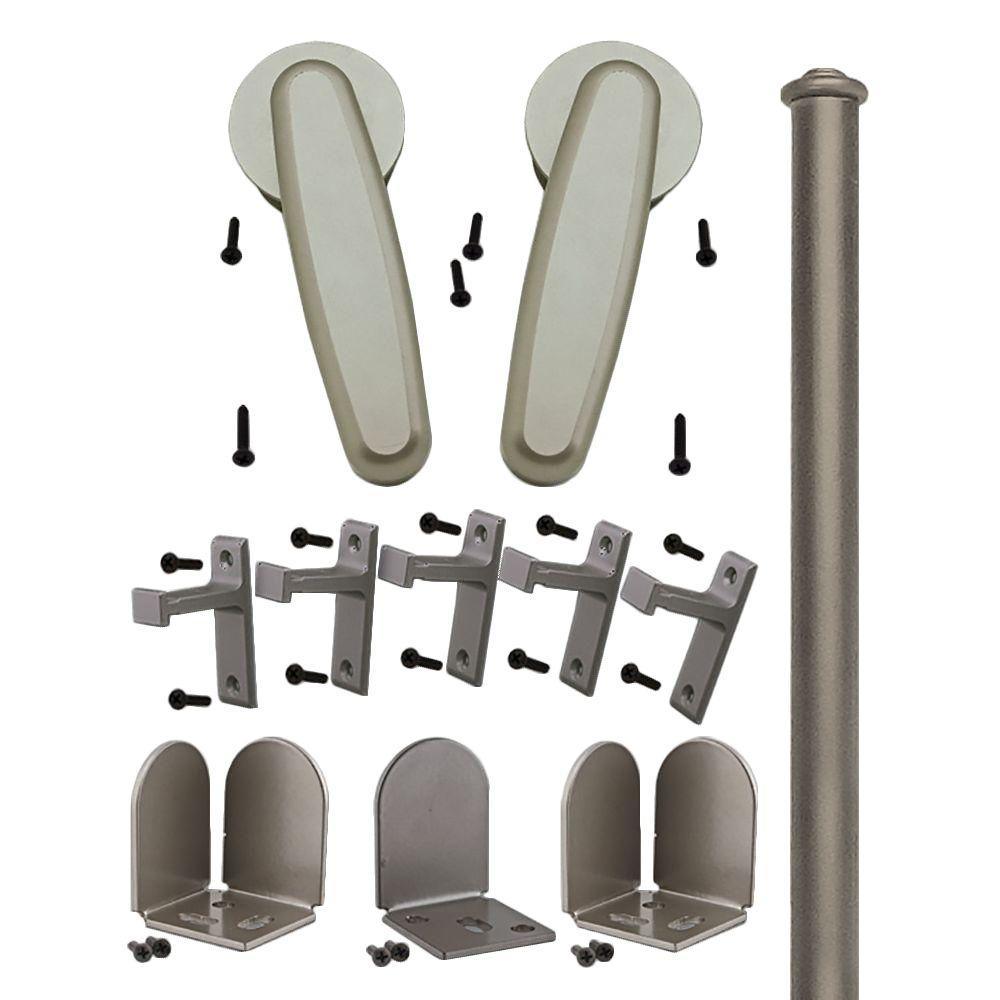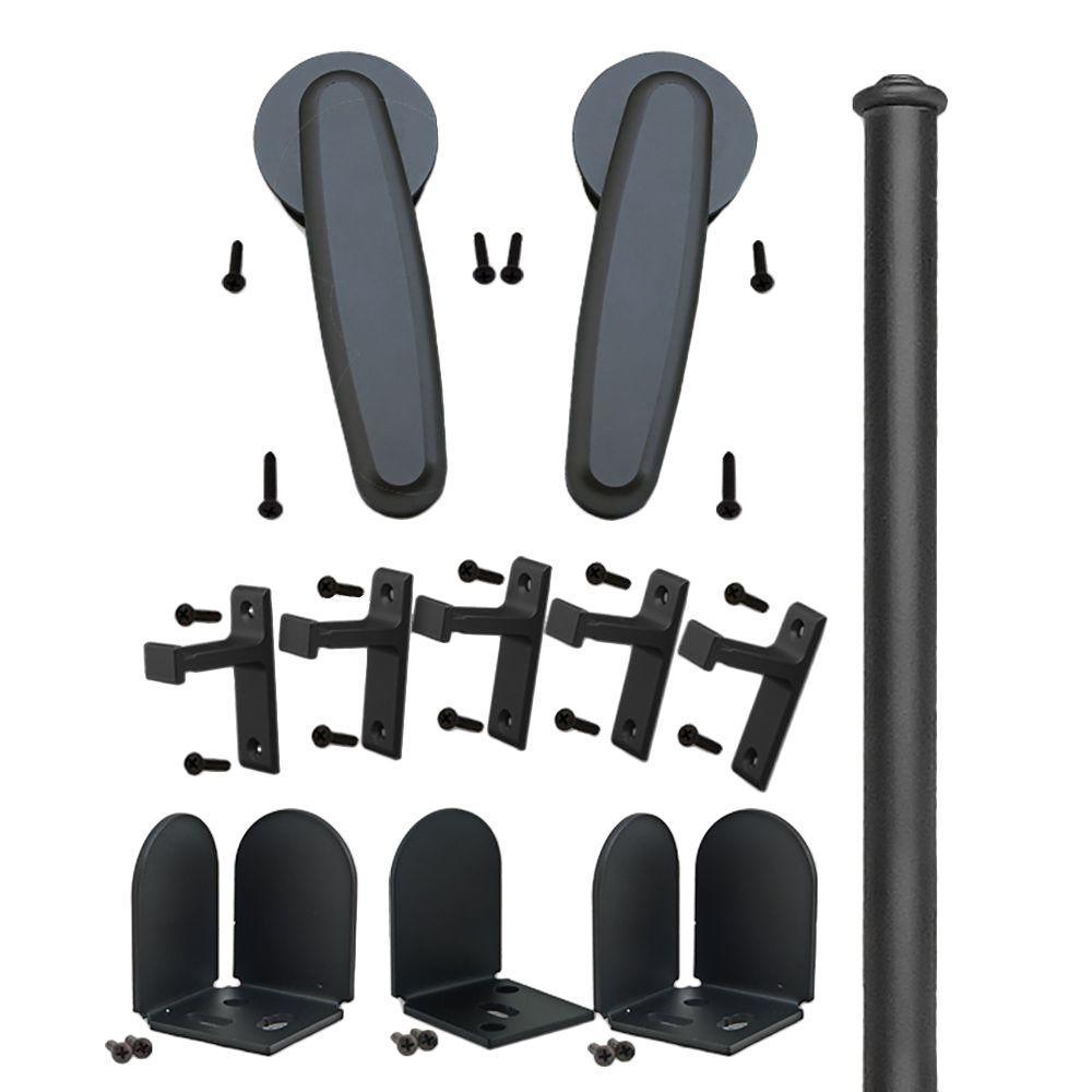 Now is your opportunity to make your home stand out from the crowd with Quiet Glide™ sliding door hardware. The Quiet Glide™ sliding door hardware will work with virtually any door style and be easily mounted to the wall in new construction or remodeling projects. The hardware kit has a durable powdered coat finish that contains 2 designer door rollers with thermoplastic wheels for a smooth and quiet rolling effect, One 72 in. solid aluminum rail, 5 vertical brackets to attach the rail to the wall, 1 pair of metal end caps to provide a finished look, 1 pair of metal center floor guides, 1 pair of designer metal floor door stops and all the hardware fasteners to assemble the barn door hardware to the door. (Door not included).
