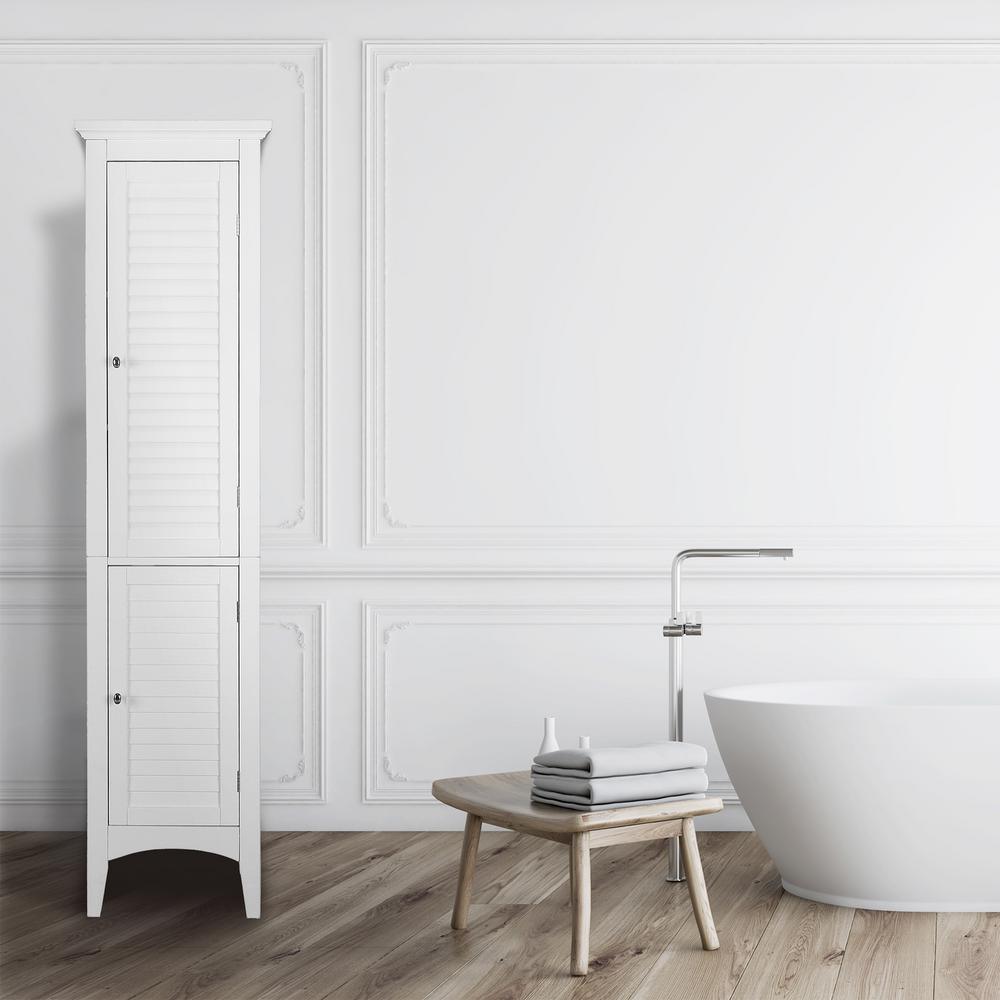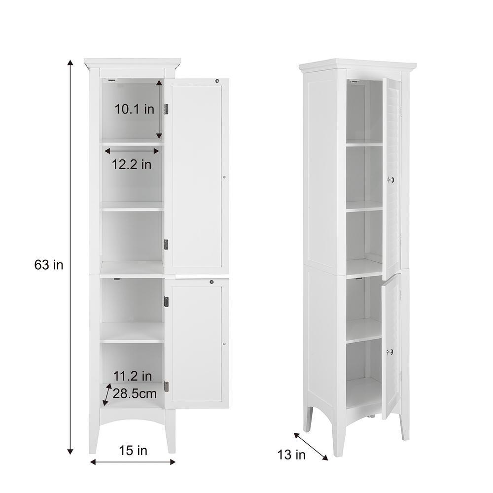 Upgrade your home storage while adding classic style with the Elegant Home Fashions Glancy Wooden Tall Tower Cabinet with Storage. This decorative cabinet features a timeless white finish with a crown molded top and skirting, chrome-finished knobs, louvered doors, and both shaker-style and arched legs for a beautiful addition to your space. The double-tier louvered doors house 4 interior shelves, with 3 tiers on the top and 2 on the bottom for a functional storage solution. Constructed from durable engineered wood with included anti-tipping hardware, this storage unit is built to provide you with long-lasting organization. Easy, step-by-step instructions and all of the hardware needed for installation are included for quick assembly. Purchase this stylish tower cabinet alone or with other items from the Glancy collection for a cohesive, updated look. The Elegant Home Fashions Glancy Wooden Tall Tower Cabinet with Storage measures 15" x 13" x 63" to provide accessible storage without taking up too much space in your living area or bathroom. An affordable extravagance. Elegant Home Fashions has been the nation's foremost manufacturer of bathroom accent furniture and bathroom accessories among the United States. Their customers include some of America's finest and most prestigious retailers, department stores, and discount retail chains. Elegant Home Fashions products have traveled the globe to focus on giving their consumers.