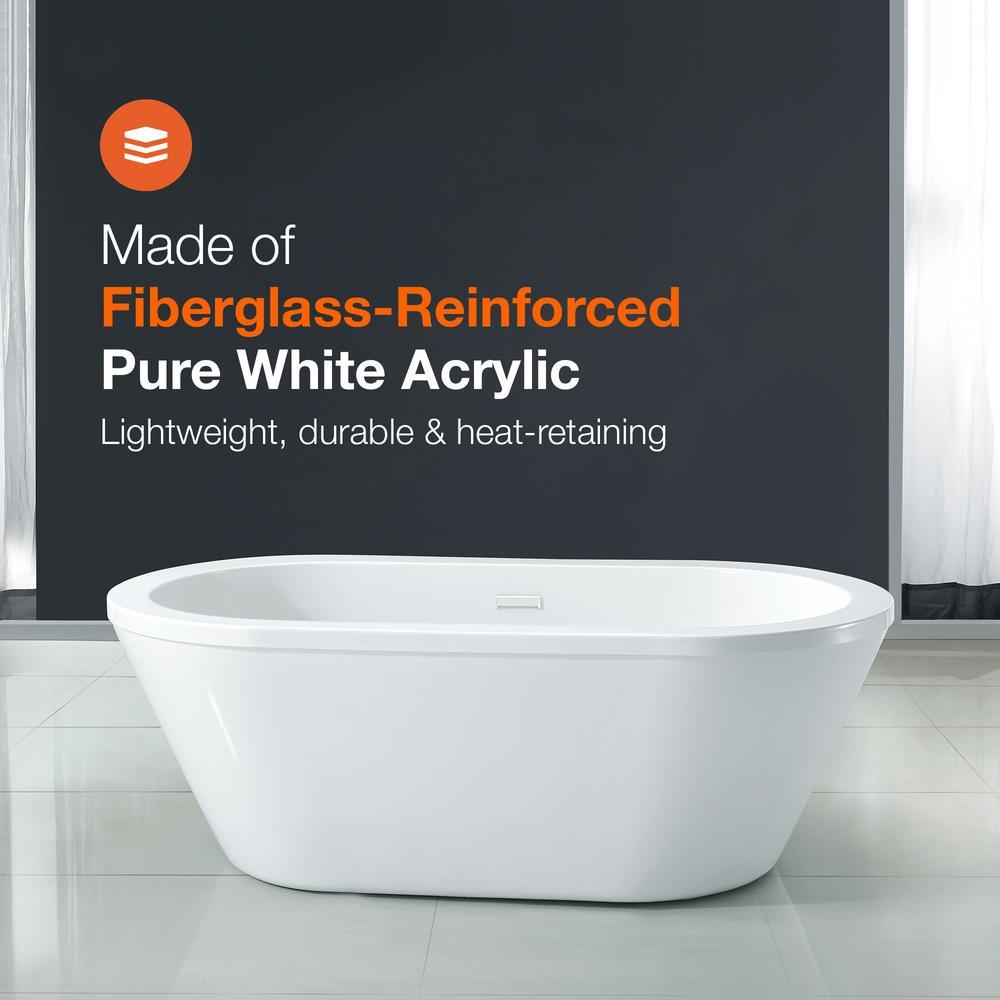 Achieve the timeless, modern look with the Schon Colton 63 in. Freestanding bathtub. The size makes it a perfect solution for smaller bathrooms. The design is constructed of high-quality acrylic reinforced with fiberglass with a pre-installed overflow drain and leveling legs for an easy installation.
