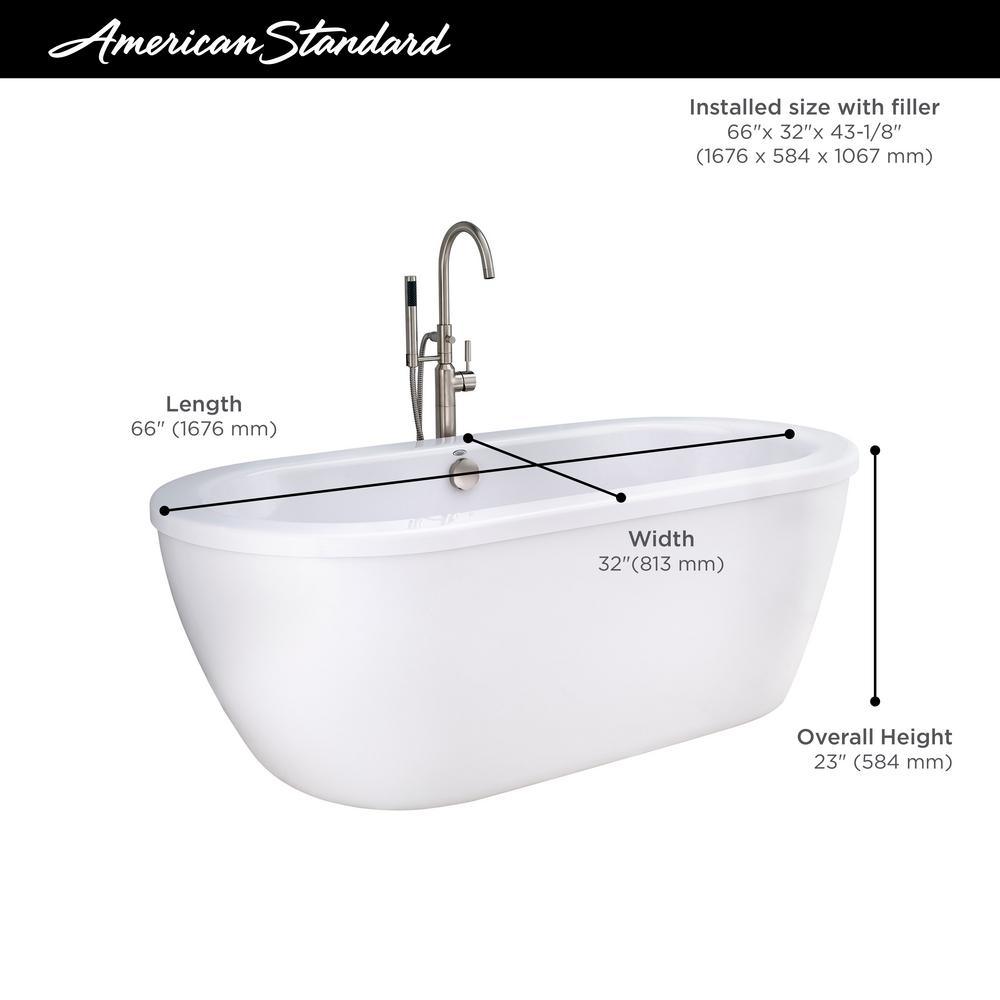 Cadet 66 in. Acrylic Freestanding Soaker Bathtub from American Standard is complemented by a polished chrome tub filler, hand shower and drain. Sleek and contemporary, Cadet is reminiscent of a Japanese soaking tub with its soft oval shape, rounded edges and extra-deep bathing well. Designed for total immersion, Cadet features a lustrous, high-gloss finish that makes cleaning easy while adding elegance to your bathroom design.