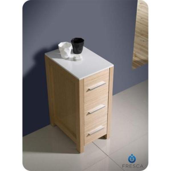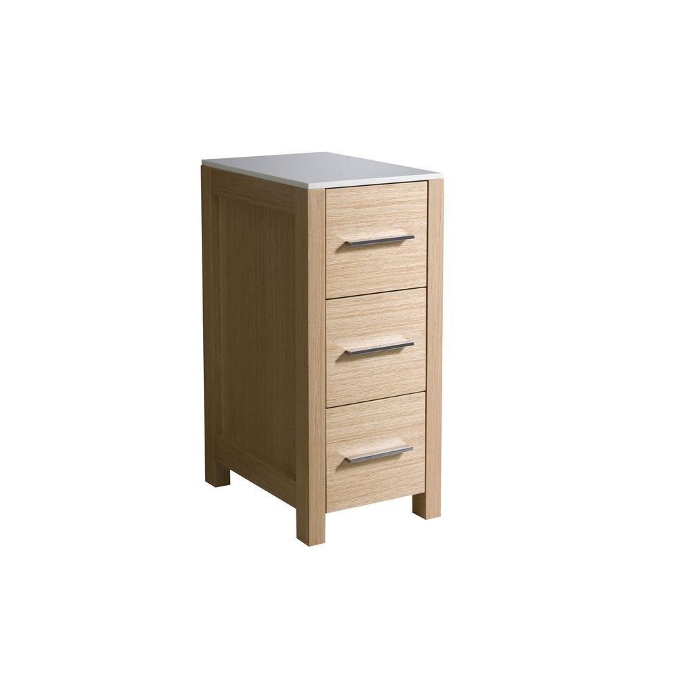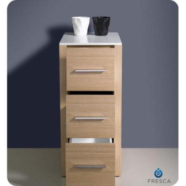 This side cabinet comes in an Light Oak finish. It has 3 spacious drawers and a sleek white glass stone composite top. The Light Oak finish matches all Fresca Torino Light Oak vanities. The white glass stone composite top matches the Torino white glass stone counter top shown with ceramic vessel bowl. Torino vanities with a white ceramic top and integrated ceramic bowl the white color with differ, these are two different materials.