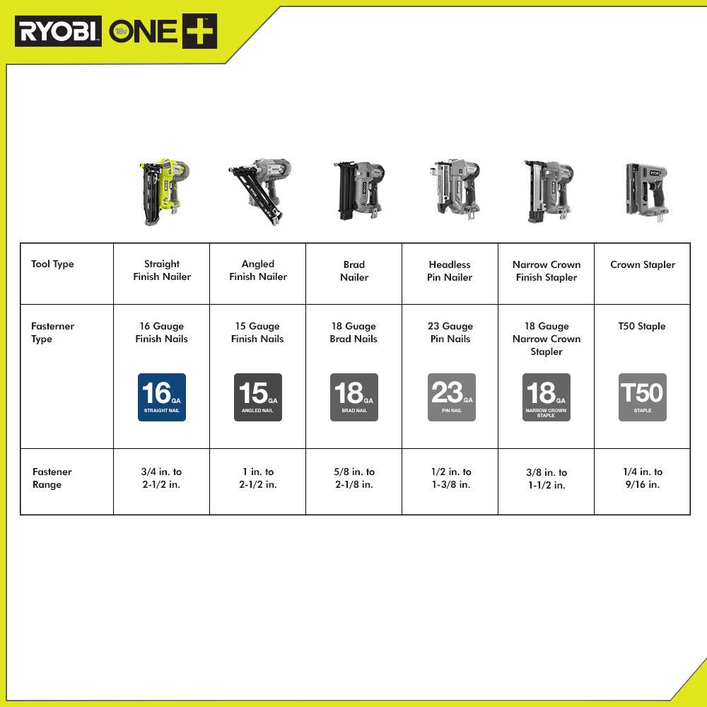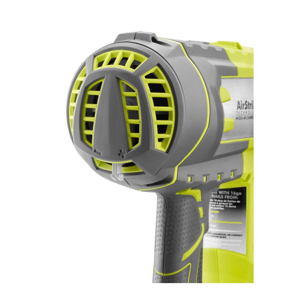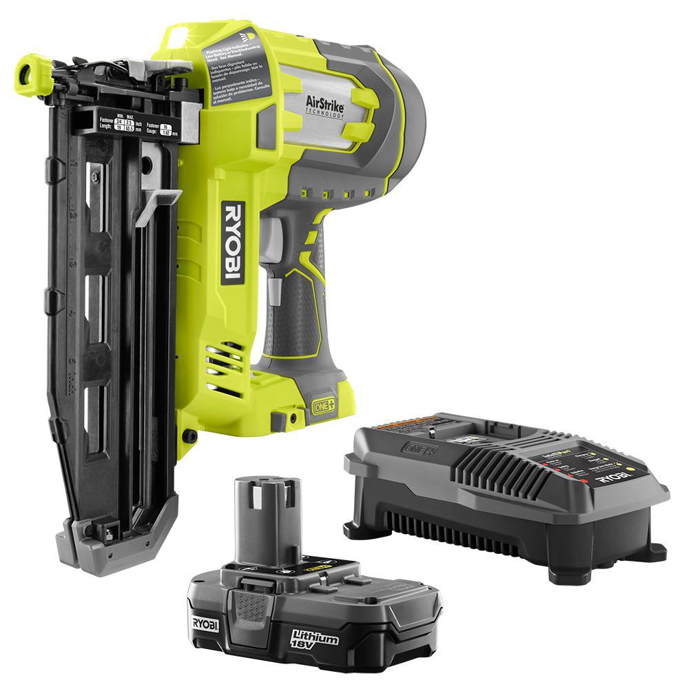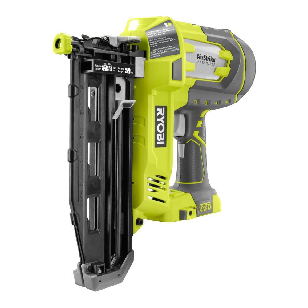 RYOBI introduces the 18-Volt ONE+ Lithium-Ion Cordless AirStrike 16-Gauge Straight Finish Nailer (Tool-Only) with Sample Nails. This 16-Gauge Straight Finish Nailer features AirStrike Technology, which eliminates the need for noisy compressors, bulky hoses, or expensive gas cartridges. This means faster setup and easier maneuvering on the job site. The RYOBI ONE+ AirStrike 16-Gauge Straight Finish Nailer drives 16-gauge finish nails ranging from 3/4 in. to 2-1/2 in. long. Best of all, this it's a part of the RYOBI ONE+ System of over 175 Cordless Tools that all work on the same battery platform. Backed by the RYOBI 3-Year Manufacturer's Warranty, this nailer includes a belt clip, sample finish nails, and an operator's manual. Battery and charger sold separately.