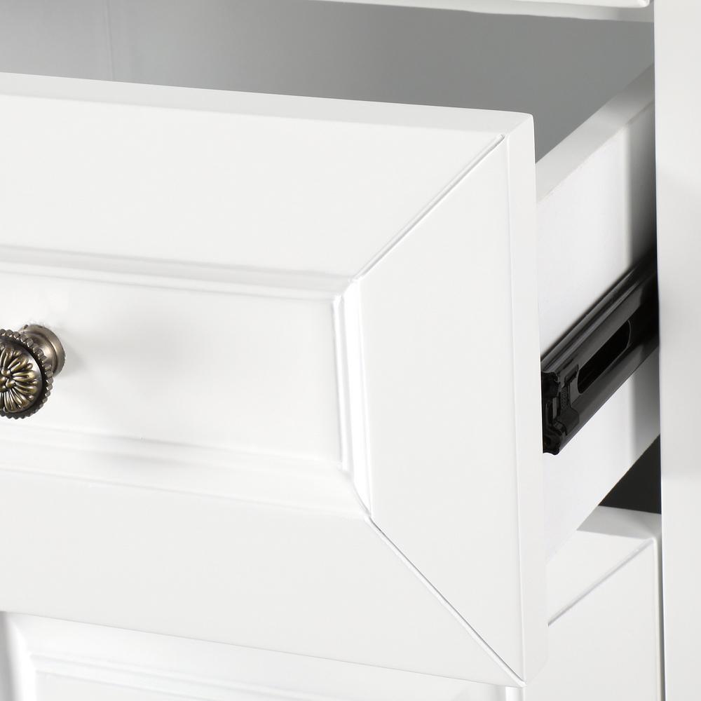 • Metal hardware with antique bronze finish provides a striking contrast to the white finish