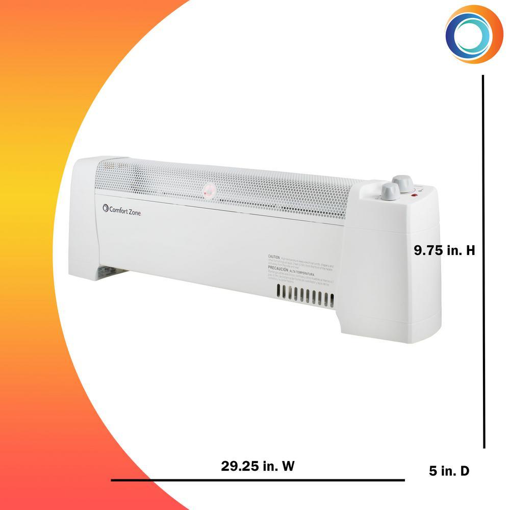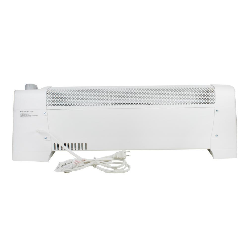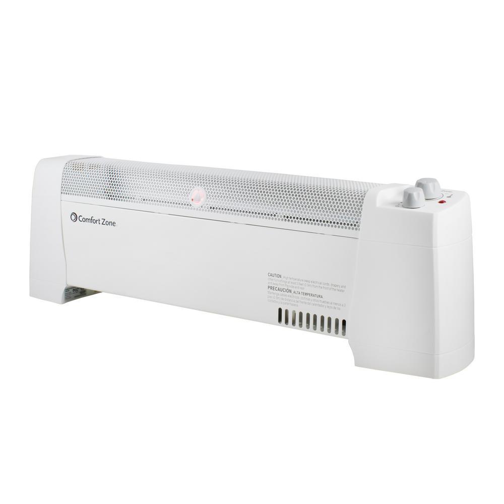 This 1500-Watt convection baseboard heater is recommended For medium-sized rooms It features 2-heat settings and an easily Adjustable thermostat, so you can control the temperature and create your optimal comfort level. Rest assured that you won't have to worry about any pets, little children or absent-minded adults due to the heater's advanced safety system. It includes a safety tip-over switch that cuts power if your heater is accidentally knocked over, a stay-cool body and an overheat protection sensor that prevents it from getting too hot. The electric baseboard heater delivers silent operation to ensure that no 1 is disturbed. Read a book, watch TV or chat without being distracted by annoying background noise. The sleek, low-profile white heater features dent-resistant end panels for durability, so the unit will look stylish for years to come. If you're looking for a way to save on home heating bills, look no further than this electric baseboard heater. It allows you to keep the room you're in at a warm and comfortable level while lowering the heat in the rest of your home, particularly in unused areas.