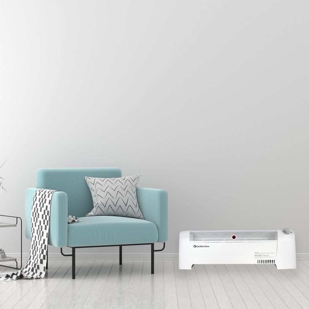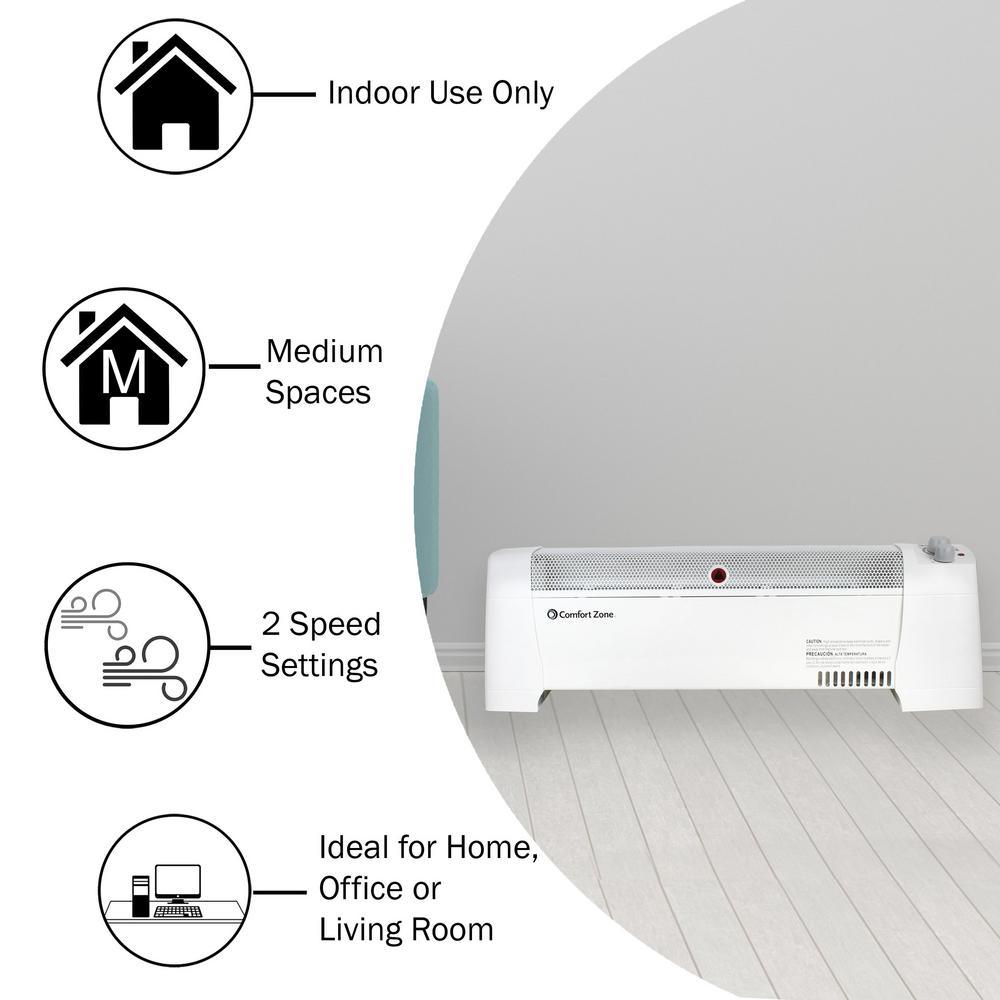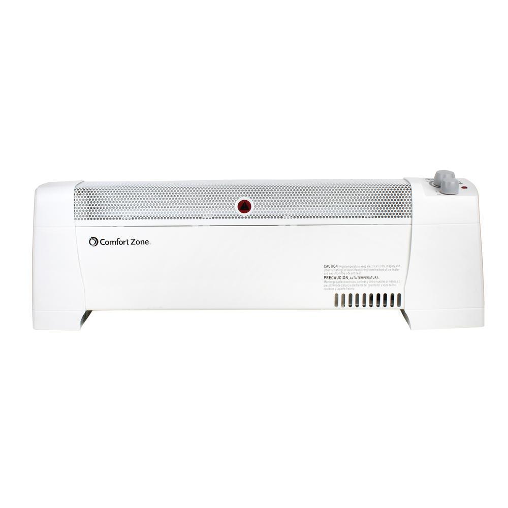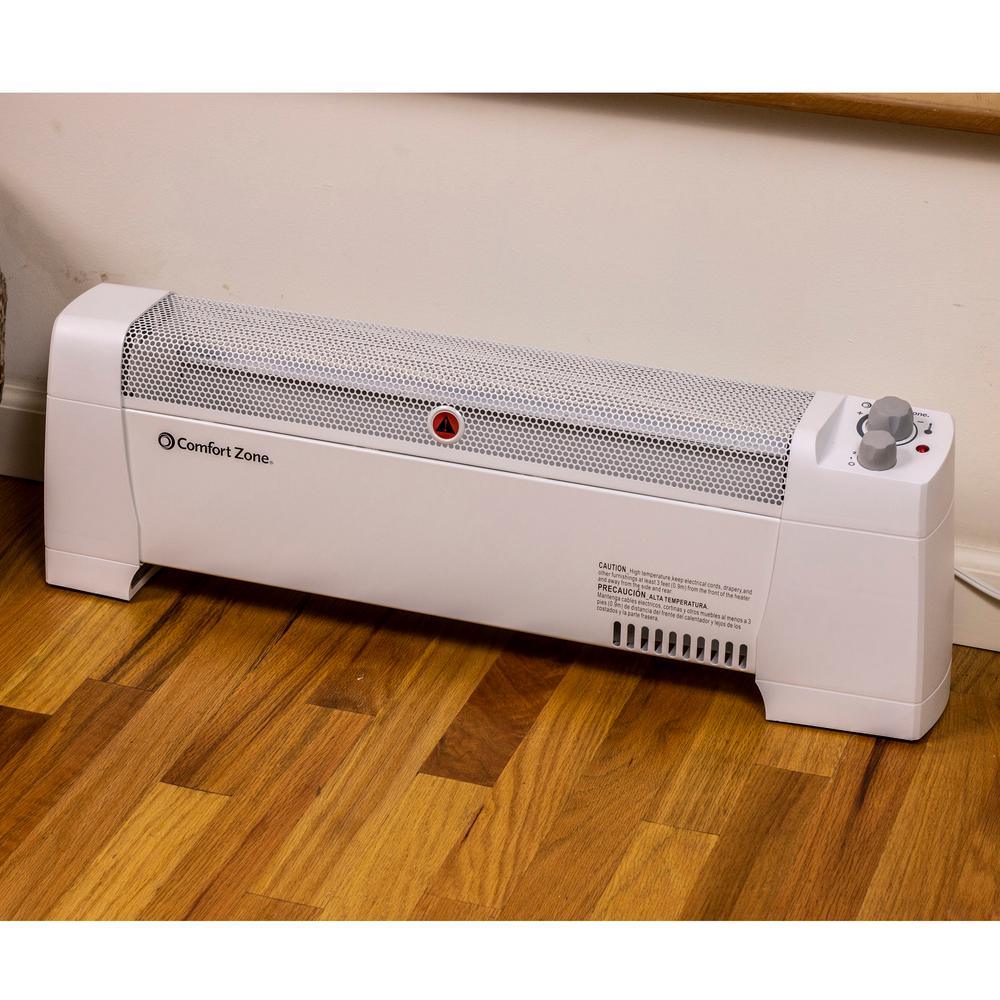 This 1500-Watt convection baseboard heater is recommended For medium-sized rooms It features 2-heat settings and an easily Adjustable thermostat, so you can control the temperature and create your optimal comfort level. Rest assured that you won't have to worry about any pets, little children or absent-minded adults due to the heater's advanced safety system. It includes a safety tip-over switch that cuts power if your heater is accidentally knocked over, a stay-cool body and an overheat protection sensor that prevents it from getting too hot. The electric baseboard heater delivers silent operation to ensure that no 1 is disturbed. Read a book, watch TV or chat without being distracted by annoying background noise. The sleek, low-profile white heater features dent-resistant end panels for durability, so the unit will look stylish for years to come. If you're looking for a way to save on home heating bills, look no further than this electric baseboard heater. It allows you to keep the room you're in at a warm and comfortable level while lowering the heat in the rest of your home, particularly in unused areas.