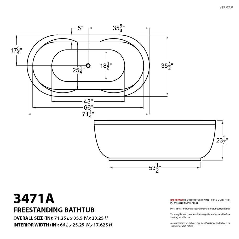 • Overall dimensions: 71.25" L x 35.5" W x 23.25" H