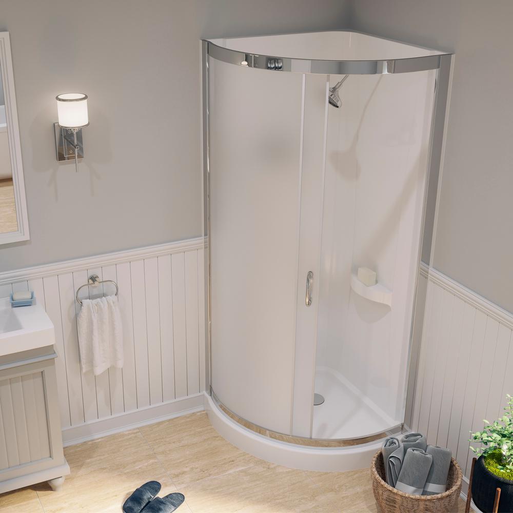 Combining functionality and style, the Breeze Premium Shower Kit is perfect for smaller to mid-sized bathrooms. This 3-piece kit includes a rounded acrylic base, acrylic walls and a premium intimate sliding door for easy access to the shower area. Made of 6 mm-frosted tempered glass, this kit will add a look of luxury to your bath so you can relax in style.