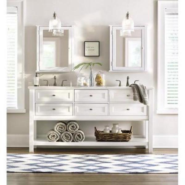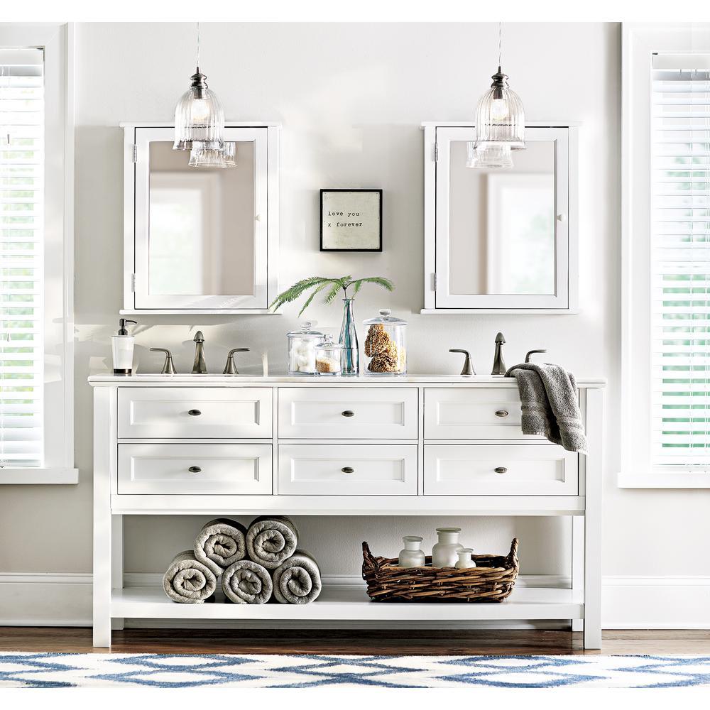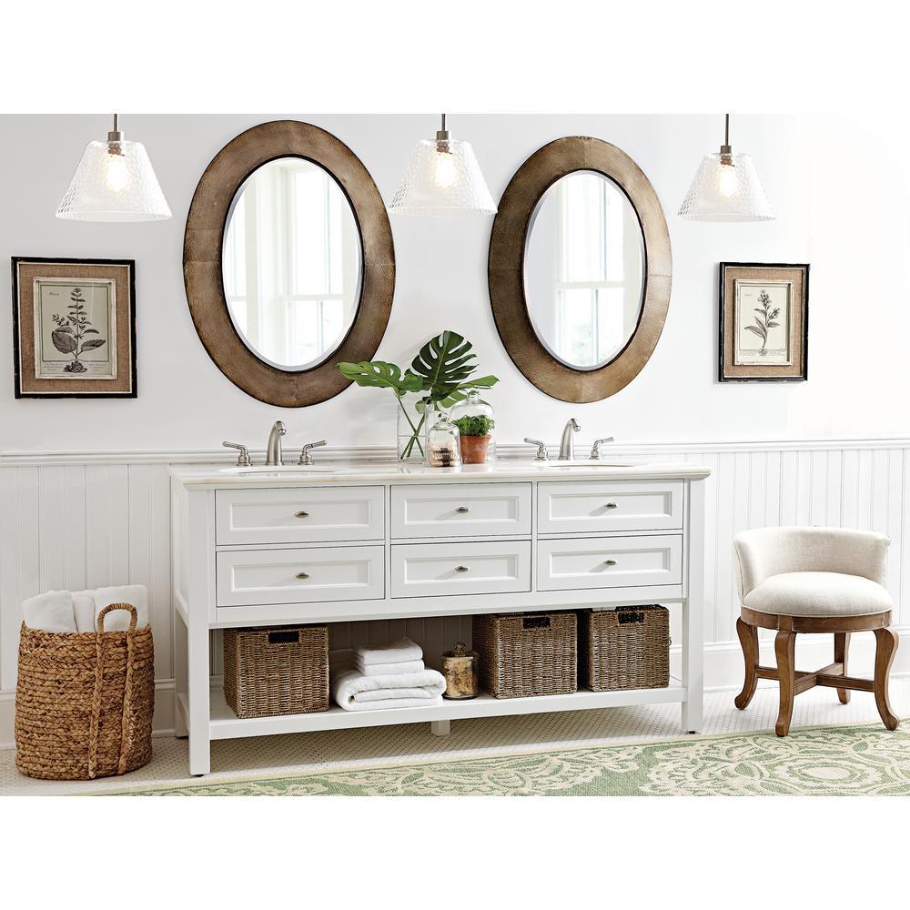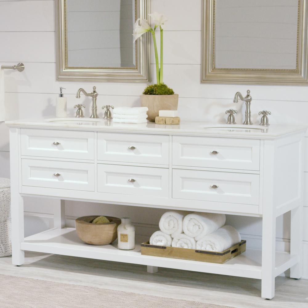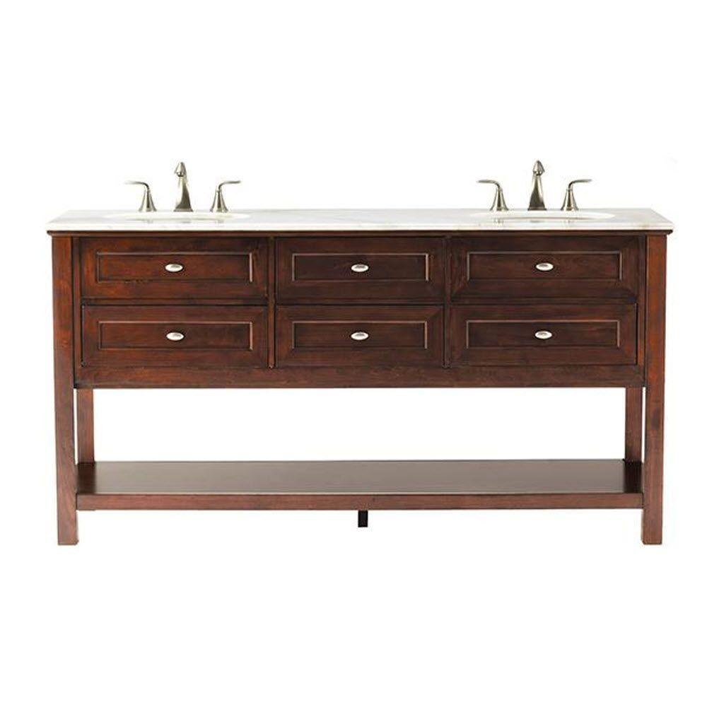 With its twin sinks and generously sized top, the Austell bathroom double vanity is the ideal choice for larger spaces. Classic ceramic basins and a distinctive marble top give this standout vanity cabinet a timeless look. Crafted of natural marble, the vanity top may contain swirling or veining. These features are part of the natural beauty of stone and have no effect on function or durability.