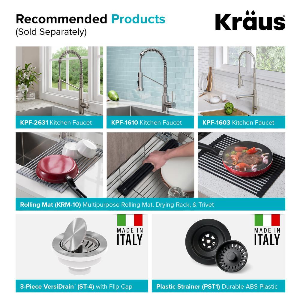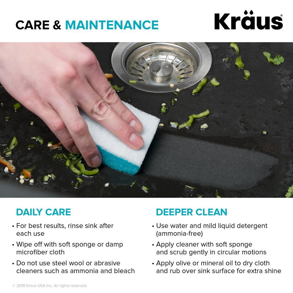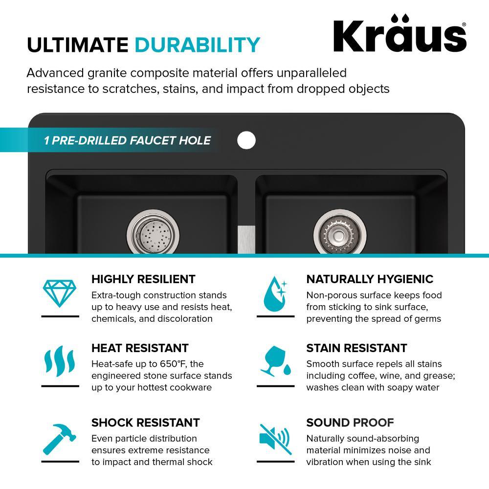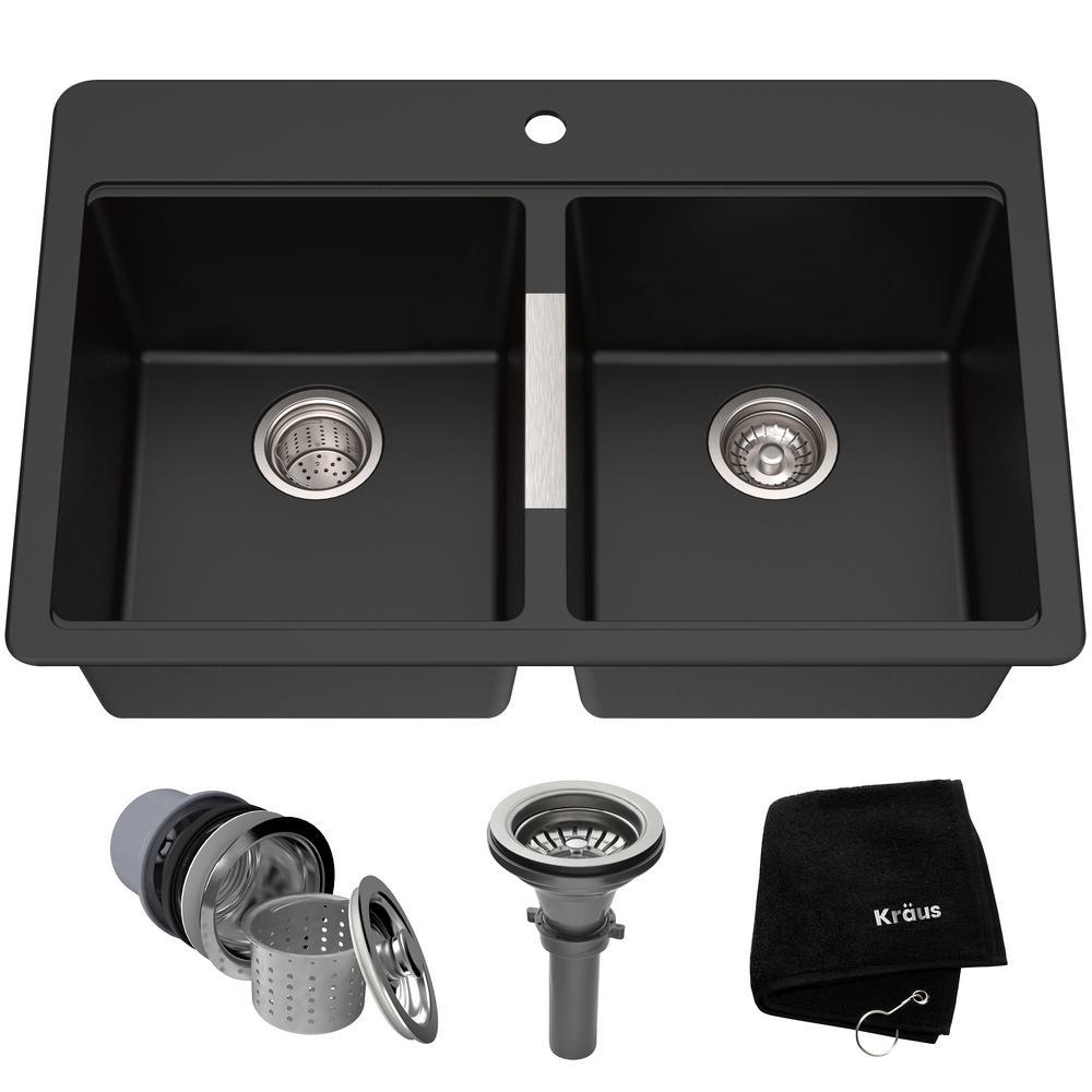 KRAUS dual mount granite sinks create an instant style upgrade for the kitchen. Constructed from 80% natural granite, with the look and feel of real stone, these modern kitchen sinks look striking in a variety of settings. Clean lines and thoughtful design details highlight the organic elegance of granite, for an eye-catching look with contemporary appeal. The extra-deep basins accommodate large dishes with ease, while the gently rounded corners make sink maintenance simple. Each non-porous, naturally hygienic sink is protected with a thermal finishing process, creating a surface that is highly resistant to heat, chemicals, scratching, chipping, and discoloration. This double bowl sink provides a lifetime of functionality with versatile style. The 50/50 split basin adds flexibility for a variety of kitchen tasks. The basin is self rimming, creating a finished look for your kitchen. Choose from easy topmount installation, or install the sink as an undermount for a seamless look. For added convenience, a basket strainer drain assembly and complimentary towel are included free with purchase. Constructed from premium stainless steel, the top-quality basket strainer assembly creates a tight seal to prevent food and debris from clogging the drainpipe. For easy installation, all mounting hardware is provided. Experience KRAUS Quality and bring your best kitchen ideas to life.
