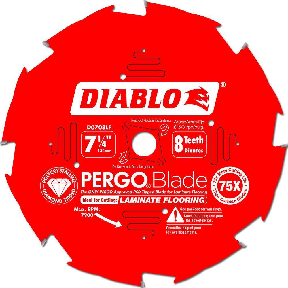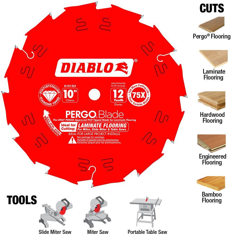 Specially designed for cutting flooring, the 10 in. x 72-Tooth Diablo PergoBlade features new laser-cut stabilizer vents for precise and clean cuts in a variety laminate and wood materials. The advanced stabilizer vents feature a permanent filler baked in from top to bottom for absorbing noise and preventing sideways movement, allowing the blade to slice through your material cleanly, quickly and accurately. The Polycrystalline Diamond-tipped tooth geometry provides for exceptional durability in cutting highly abrasive materials. Engineered to outlast ordinary carbide-tipped blades by 75X, this saw blade effortlessly cuts through laminate planks to create finely honed edges without burnout. Also suitable for cutting bamboo, hardwood and engineered flooring, the Perma-SHIELD non-stick coating on this blade reduces drag so there is minimal friction and heat buildup.