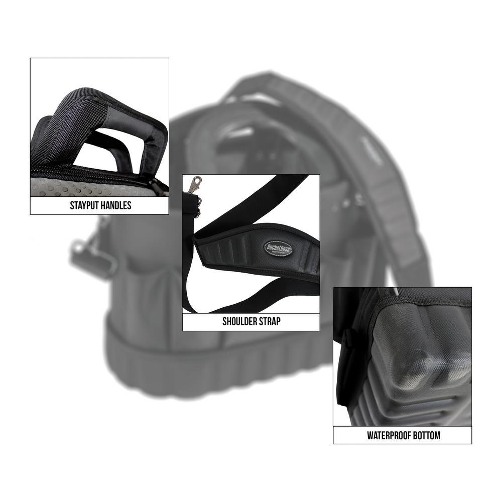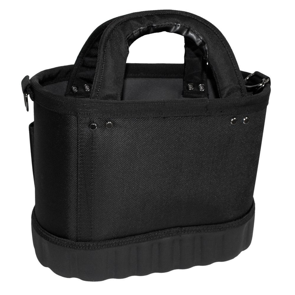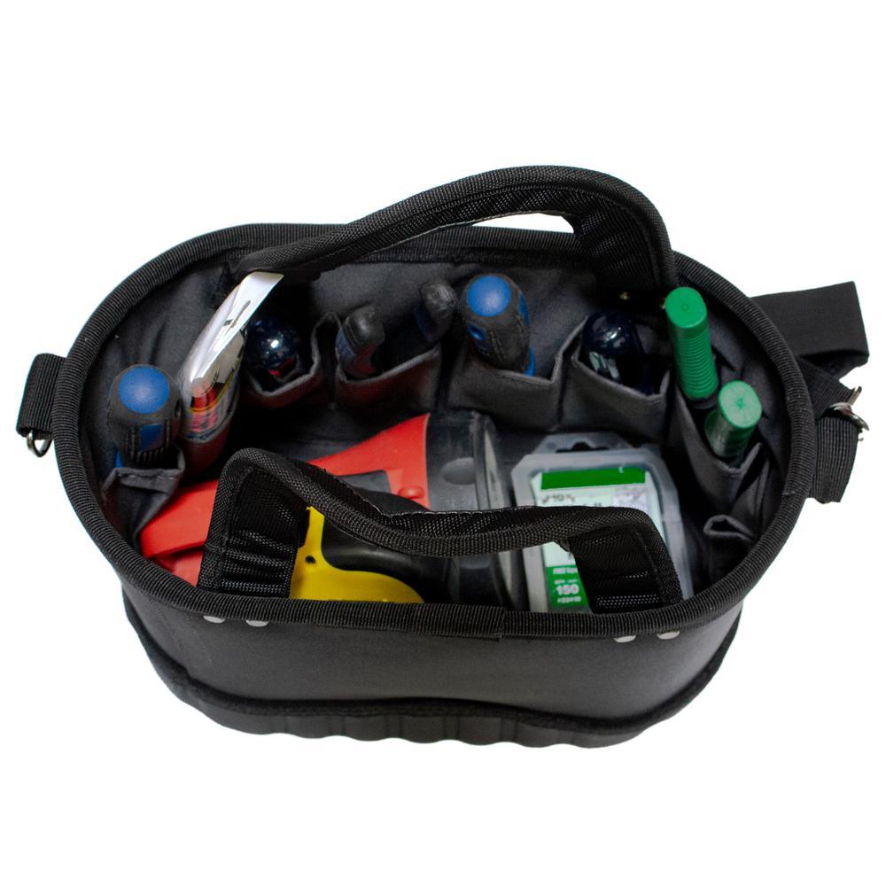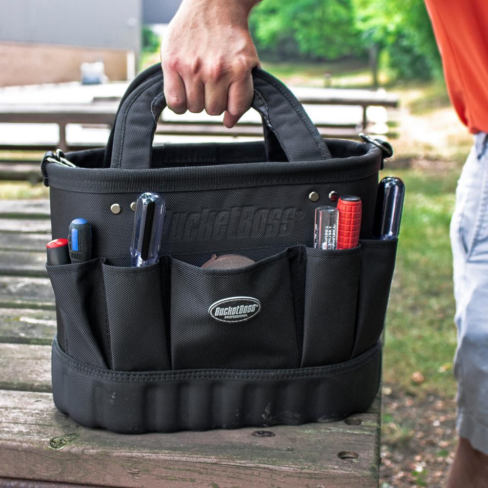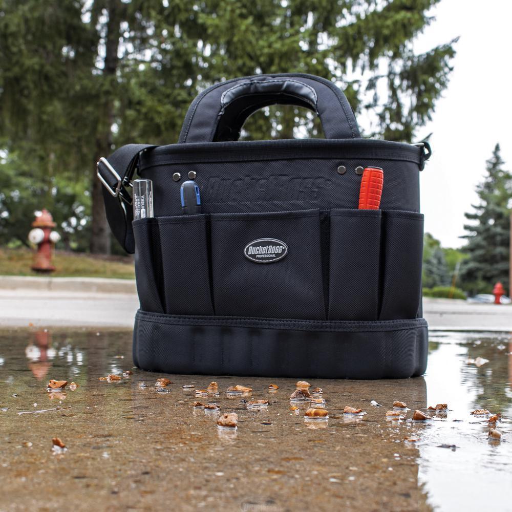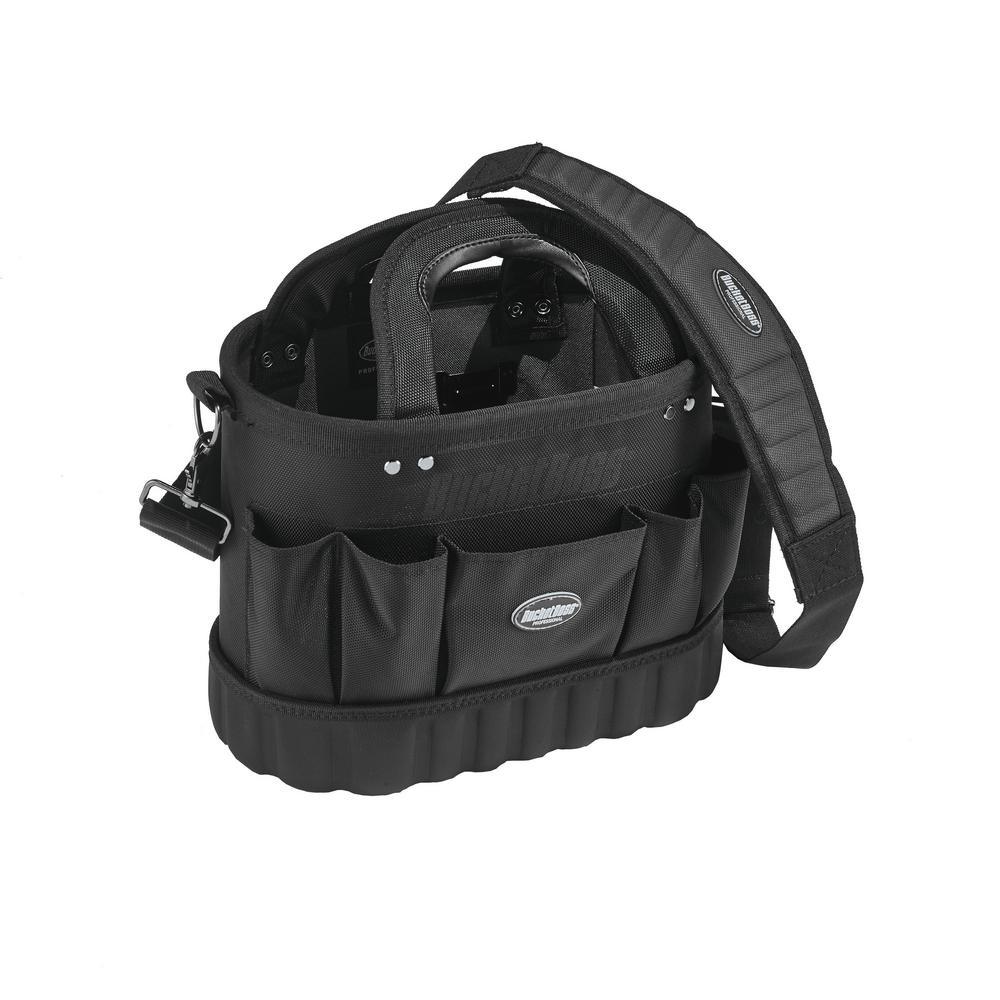 Bucket Boss is making accessing your hand tools easier by introducing the Pro Oval 14 in. Tool Tote. Made of heavy-duty 1680 Poly water-resistant main body fabric and a molded water proof bottom this bag features 13 total pockets and will hold small and medium size hand tools. It also has new Stay put handles which will remain upright all the time unlike most conventional bag handles. To make transporting easier, there is a steel handle with a foam padded grip. It even has an ID window so you can ID your bag.