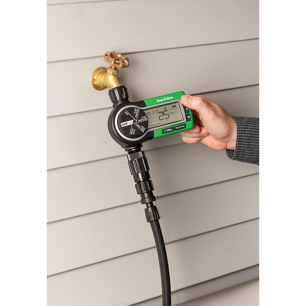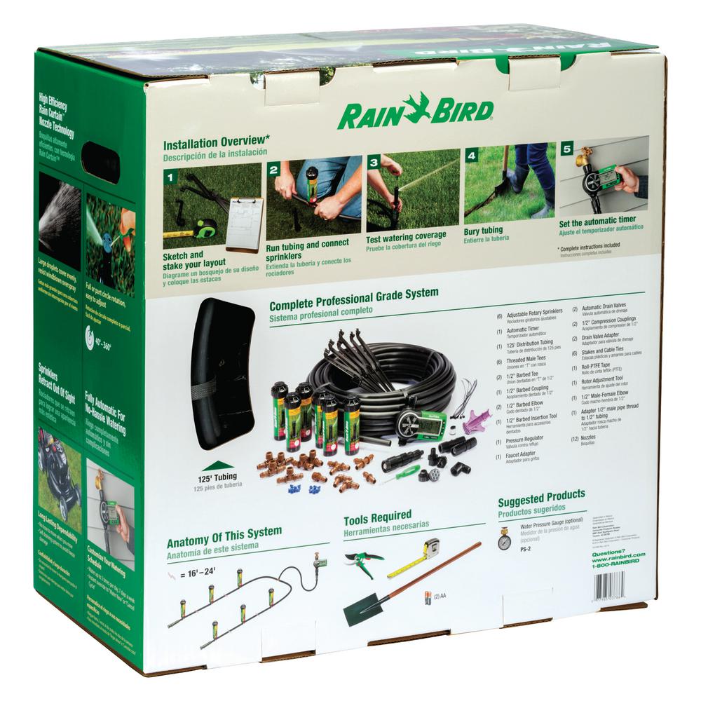 If you are tired of hassling with hose and sprinklers, and getting poor results from manual watering, this new automatic system is a perfect solution. The first professional grade Rain Bird sprinkler system designed for homeowner installation, it provides everything you need to keep your lawn green season after season while saving water. The system attaches to any outside faucet and includes six high-efficiency rotary sprinklers with patented Rain Curtain nozzle technology. The same sprinklers used in professionally installed systems worldwide, these rugged sprinklers deliver a rotating curtain of water with large droplets that fall quickly to avoid windblown overspray and to cover evenly from head to perimeter for reduced overall watering time. Simple adjustments for spray rotation and distance help you keep the water on your lawn and off the house, sidewalk and driveway. Controlling the sprinklers is Rain Bird's heavy duty timer with large readout screen and simple scroll settings for automatic watering any days of the week and up to two times per day. Flexible scheduling allows customizing your settings for specific needs such as watering of slopes where two short cycles will allow the water to soak in better, avoiding runoff waste. The timer also features manual buttons for "Water Now" and "Cancel" watering without affecting the program. An illustrated manual shows the 5-step installation process as well as example sprinkler placements for different lawn areas.