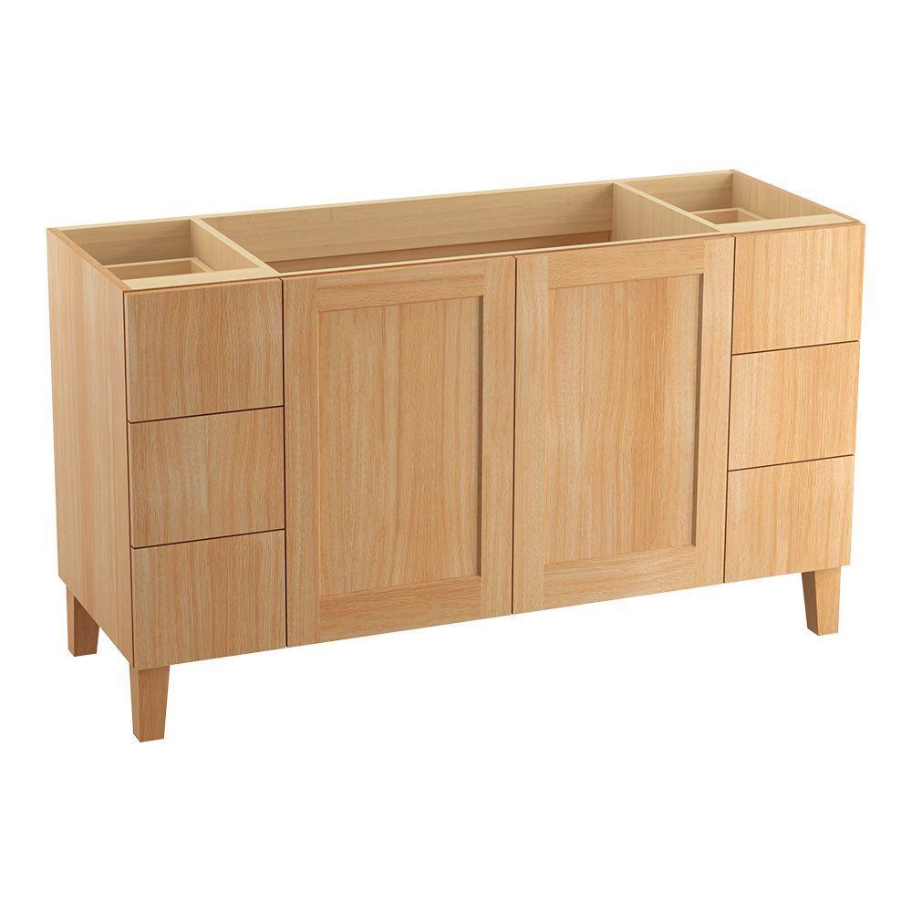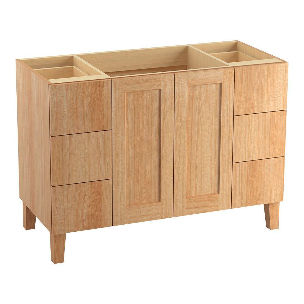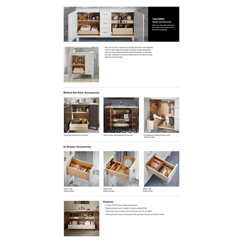 Breathtaking design meets unrivaled craftsmanship in the KOHLER Tailored vanity collection. No detail was overlooked in the meticulous crafting of this collection, from the premium hardwoods to the specially designed hardware and vanity tops, all available in an array of finishes to create your own look. This Poplin vanity draws its inspiration from Craftsman and Shaker furniture designs and features a prominent wood grain for a robust, rustic feel. Complete your vanity with a coordinating top, hardware and accessories from the collection.