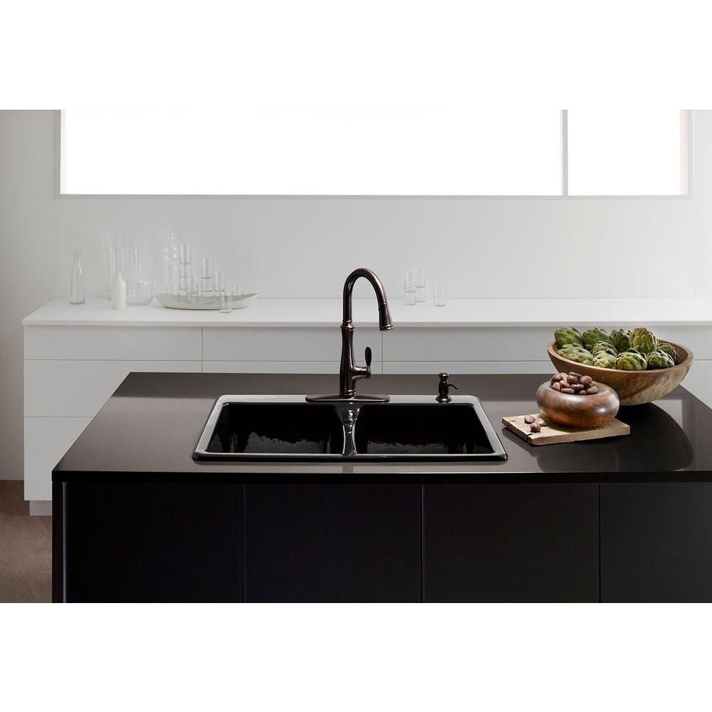 With its classic, versatile style, Deerfield instantly updates any kitchen. Redesigned with deeper bowls and tighter corners, this double-equal sink features approximately 20% more basin volume than previous models, giving you plenty of room for cleaning and prep with minimized splashing. A new slimmer saddle and rim offer a crisp, clean look. Crafted from enameled cast iron, this sink resists chipping, cracking, or burning for years of beauty and reliable performance.
