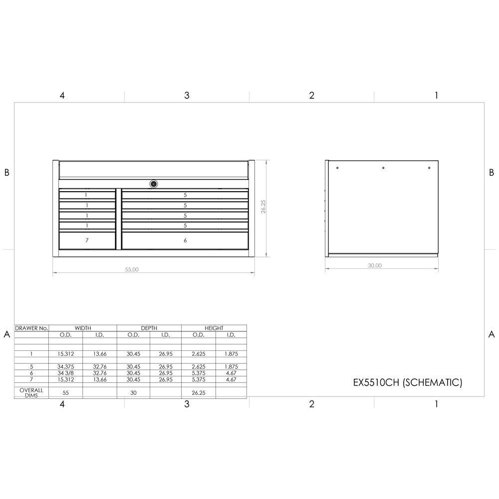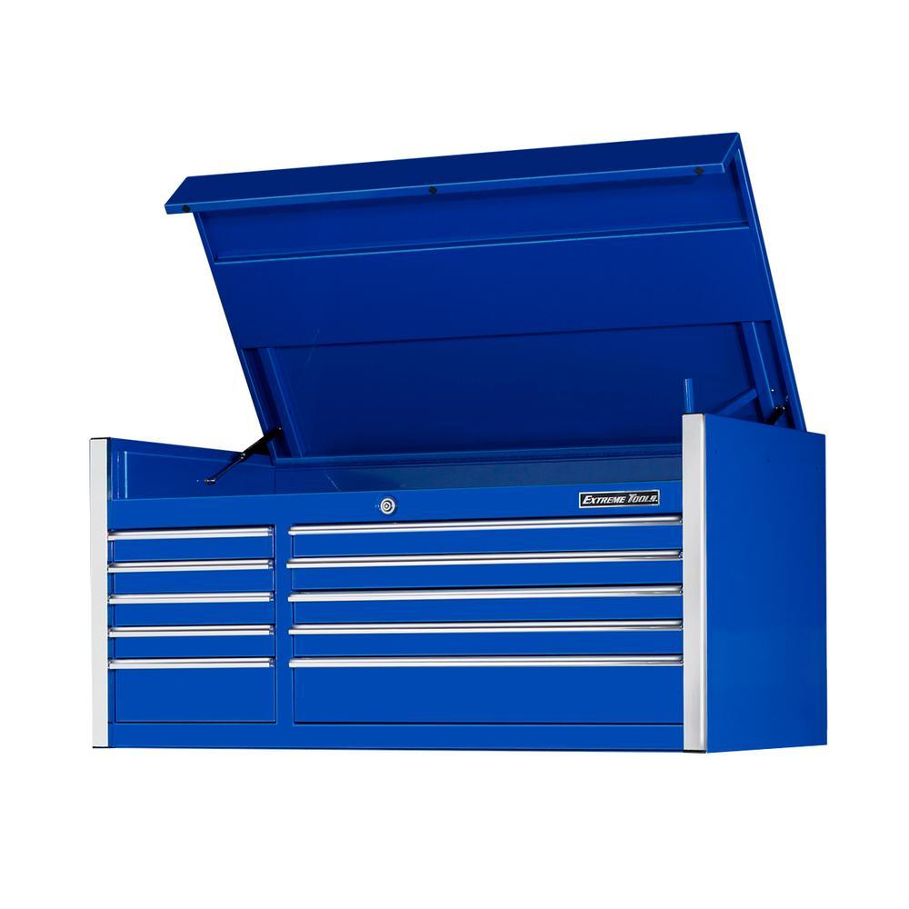 Keep your garage neat with the Extreme Tools EX Professional 55 in. 10-Drawer Top Tool Chest in Blue. Designed to offer increased durability, it features a 16-Gauge steel construction, great for both DIYers and professional tradesman. This tool storage system has an AkzoNobel high-gloss coat finish to ensure better durability and protection against workshop damage such as stains, scratches and corrosion. It has a lid that features gas struts, offering improved safety when opening and closing. It has 10-drawers 5 small and 5 medium and features a total holding capacity of 23,213 cu. in., offering you plenty of storage for all your equipment. Excellent for effortless operation, this top tool chest is made with ball bearing slides that can hold up to 300 lbs. to accommodate heavy loads. This Extreme Tools tool cabinet features a keyed lock to offer you peace of mind. Stay neat and organized during every project with the Extreme Tools EX Professional 55 in. 10-Drawer Top Tool Chest in Blue.