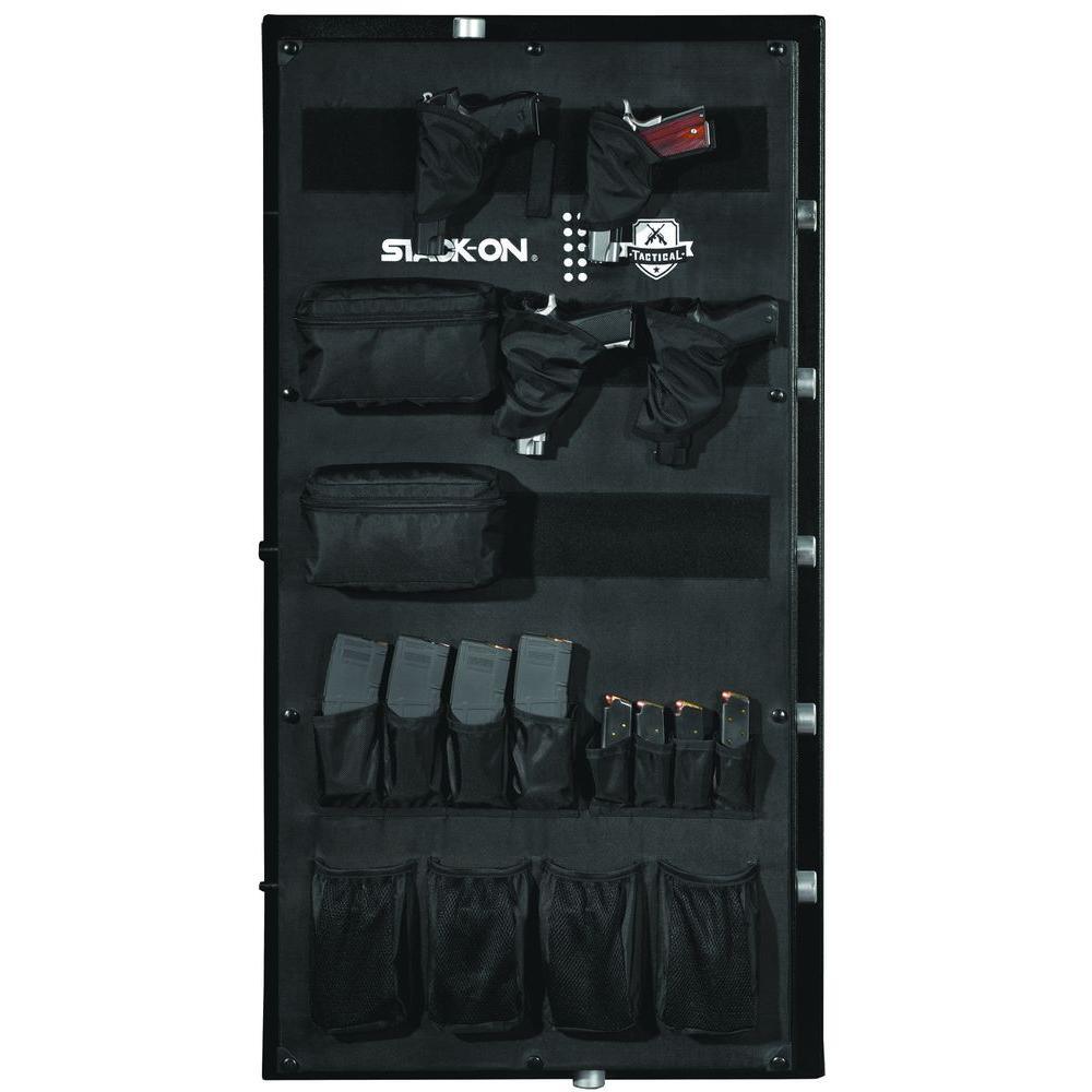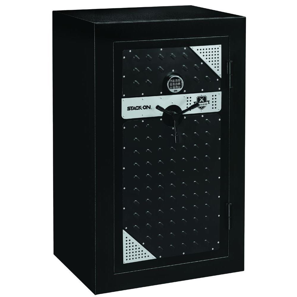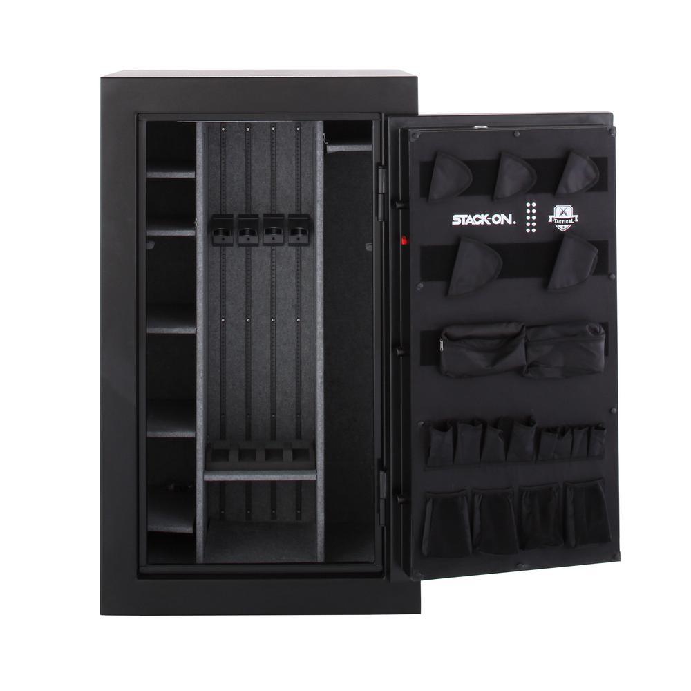 This Stack-On 20 Gun Tactical Fire Resistance Safe holds 4 tactical weapons and 16 long guns or valuables. It has a reinforced steel door filled with fire retardant material. Door stripping expands and seals the door when exposed to fire. This safe is available in a matte black color with silver/gray accents.