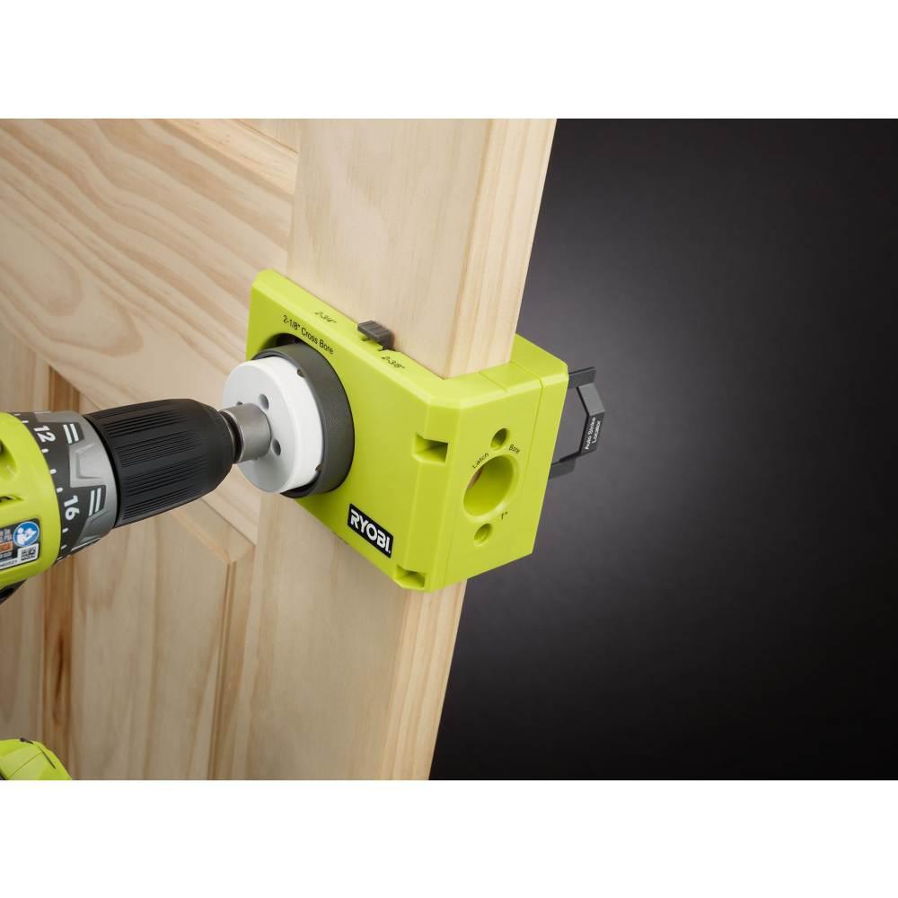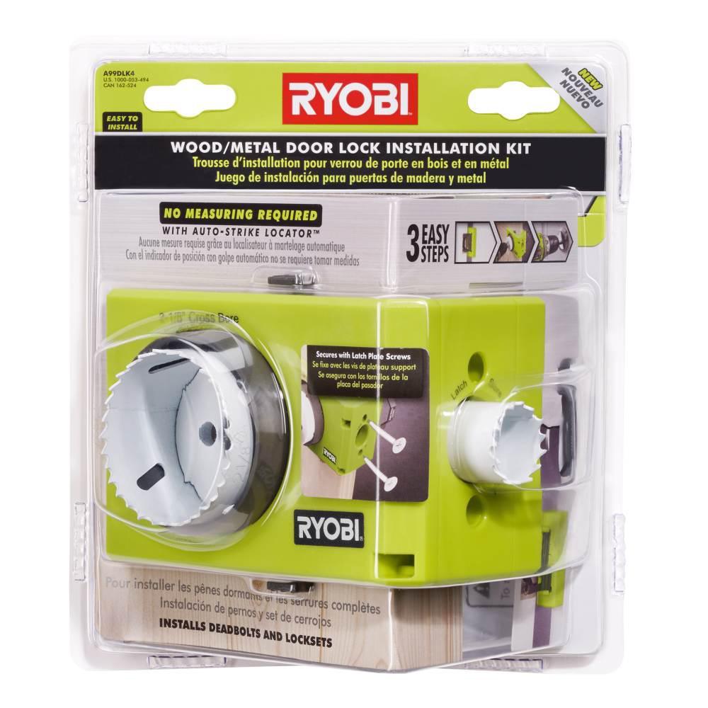 RYOBI introduces the Wood/Metal Door Lock Installation Kit. The RYOBI Wood/Metal Door Lock Installation Kit guides hole saws when installing locksets and deadbolts. This kit features a dual backset adjustment and auto-strike locator for improved accuracy with no additional measurements needed. For use on doors with a thickness range of 1-3/8 in. to 1-3/4 in., the Wood/Metal Door Lock Installation Kit includes a Door Lock Bracket, two bi-metal hole saws, an arbor with pilot bit, a 1 in. wood spade bit, bronze oxide drill bits, and a 2 in. double ended screwdriver bit.