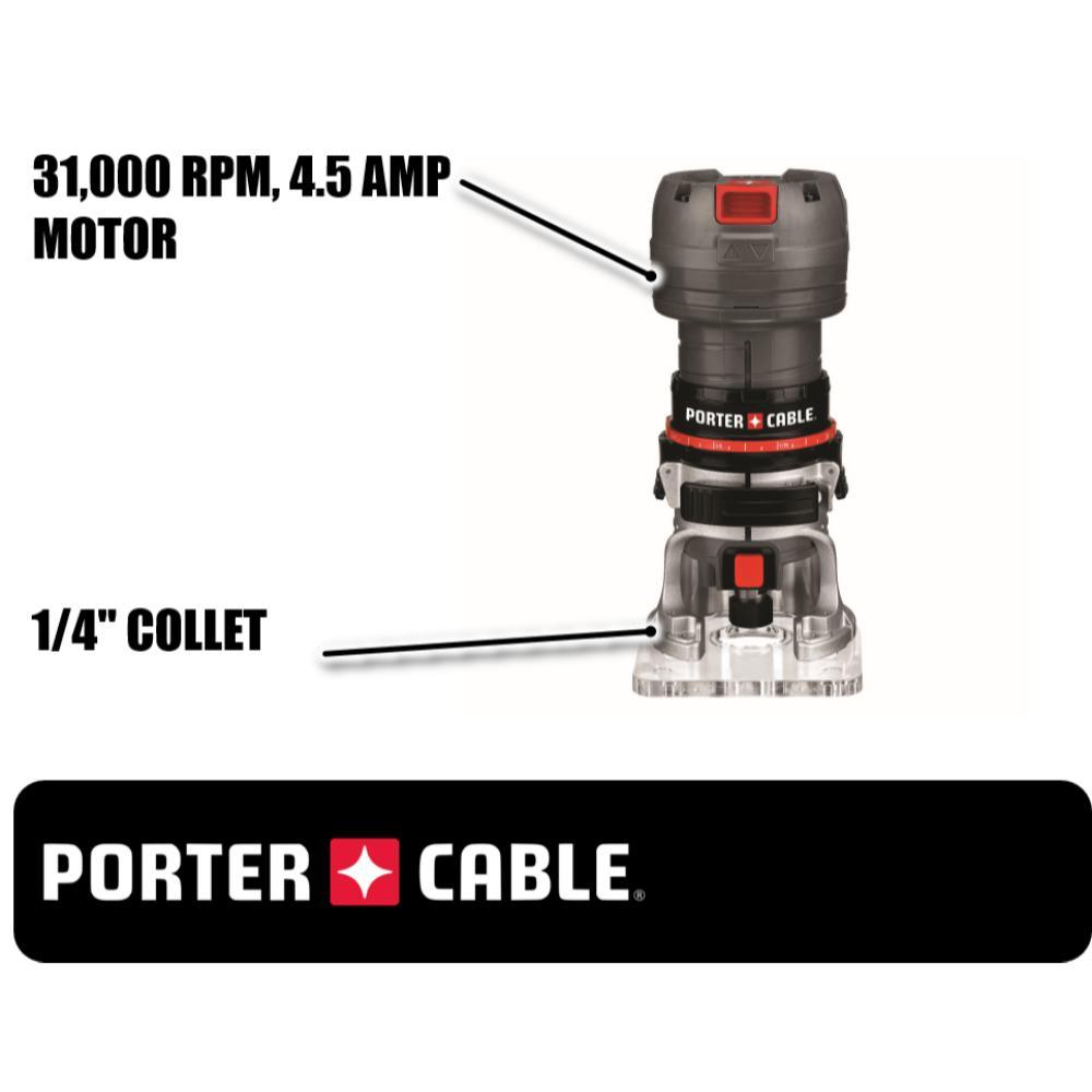 The Porter-Cable PCE6430 1/4 in. Laminate Trimmer features a 31,000 RPM, 4.5 amp motor that provides the power and durability required to cut in various materials. This trimmer is perfect for most trimming, small edge forming and hinge routing applications. The kit includes Motor, Standard Fixed Base, 1/4 in. Collet, Collet Wrench, Straight Edge Guide and Operating Manual.
