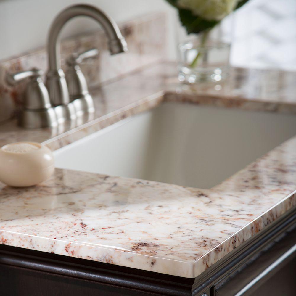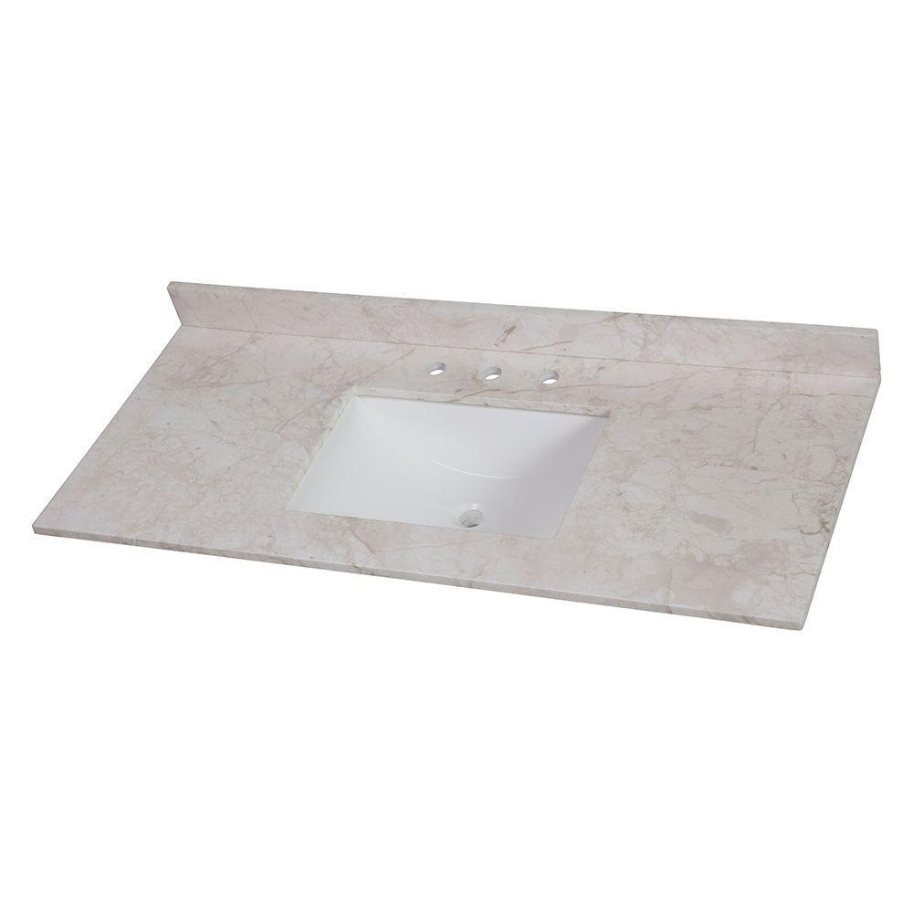 The Stone Effects 37 in. W Vanity Top in Rustic Gold features natural stone-like surface patterns that instantly add elegance and beauty to your bathroom. Coated with Diamond Shield, a surface coating that makes the vanity top resistant to stains, bacteria, mold and mildew; this durable vanity top is pre-attached to a white bowl for your convenience. The vanity top's 3-1/2 in. backsplash helps protect the wall and back of your cabinet against splashes and spills.