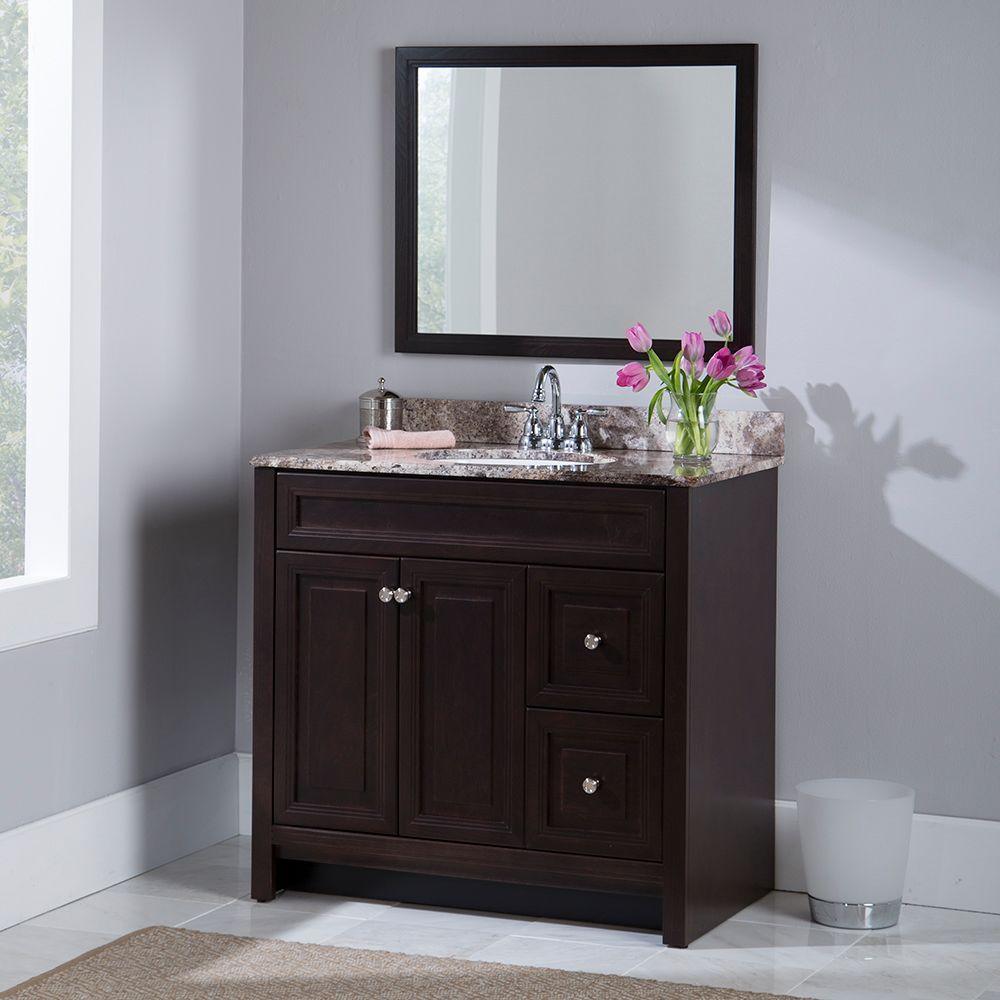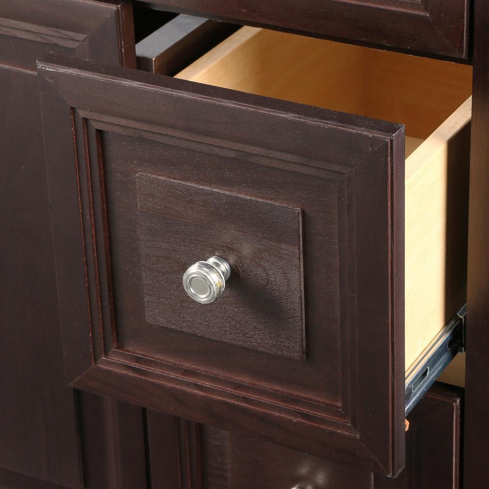 Crafted with quality and detailing, the Brinkhill collection will add charm to your bathroom. This 36 in. vanity features 2 large drawers on full extension drawer glides making it roomy enough for all your bath items. Accented with a furniture toe-kick and a dustgaurd for easy cleaning, the Brinkhill vanity is finished in a rich chocolate color and paired with nickel cabinet hardware.