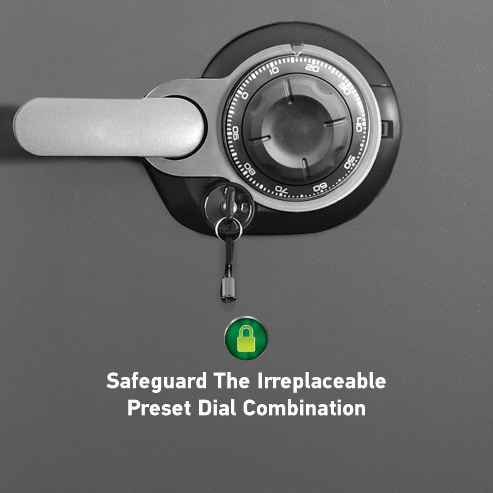 • Preset dial combination fire safe with secondary locking key for strong security; combination safe features six live-locking bolts, steel construction, pry-resistant hinge bar, file folder drawer, and bolt down hardware
