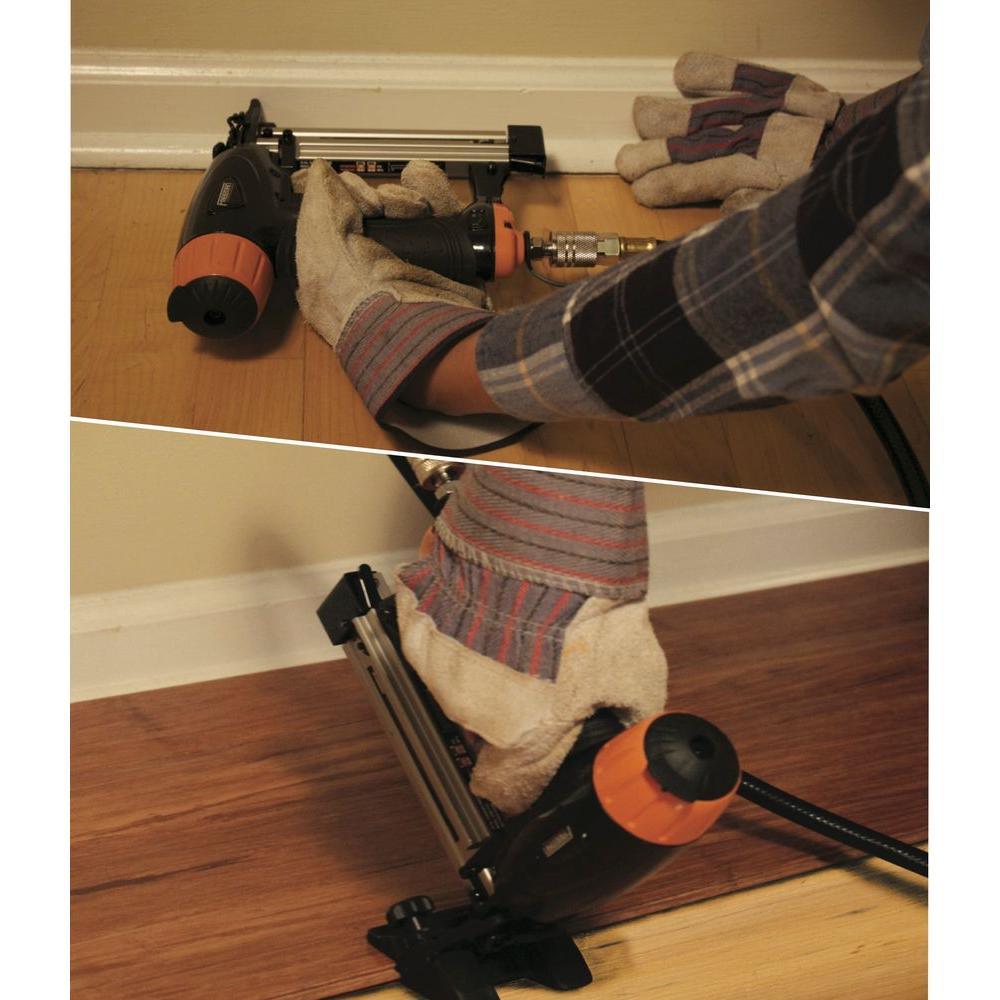 4-in-1 mini flooring nailer and stapler: ideal for installing 1/4 in. to 1/2 in. solid or engineered flooring with the 45° flooring base attachment, or trim and finish work with the regular nose cover