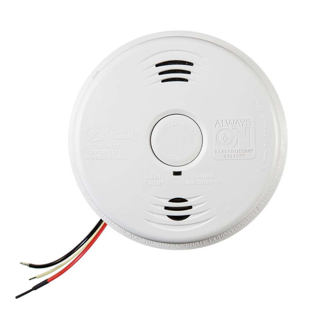 Kidde 10-Year Worry Free 120-Volt Hardwired-Interconnected Combination Smoke and Carbon Monoxide Alarm. The alarm is suitable as a single station and/or multiple station (24 devices) alarm. This alarm contains a 10-year sealed-in lithium battery backup. No batteries to replace in this hardwired alarm and a limited 10-year warranty.
