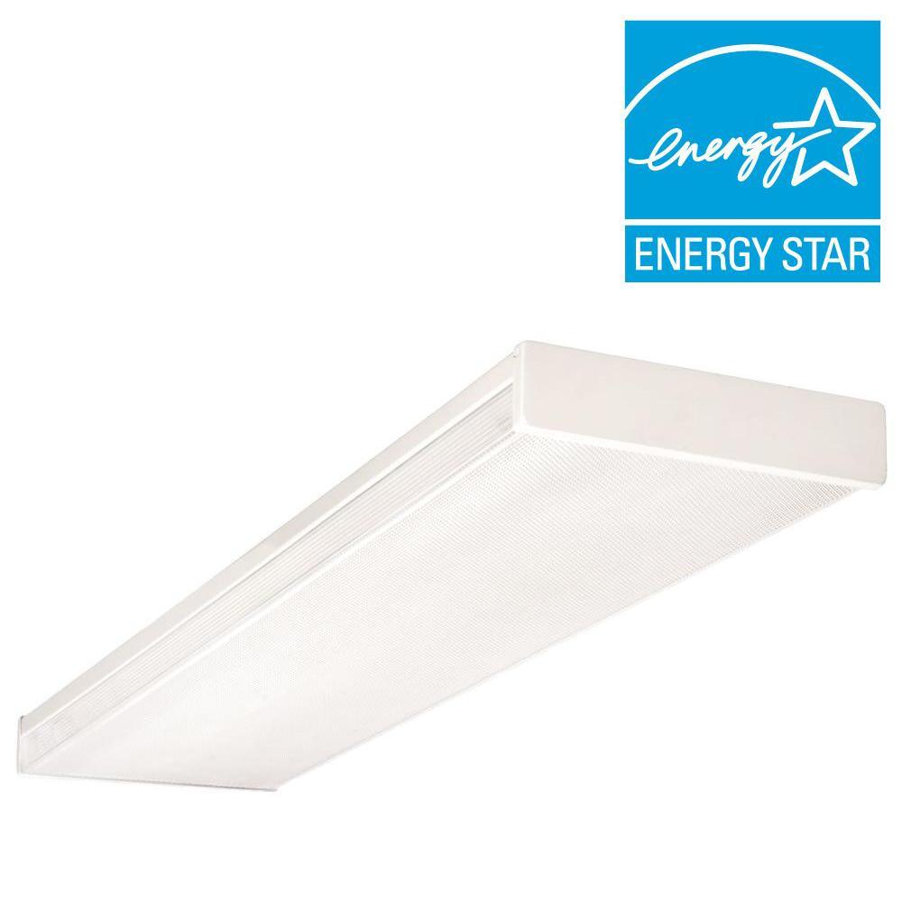 This sturdy 4-Light 32-Watt T8 wraparound is manufactured with 20-Gauge steel and a clear prismatic acrylic lens. Features 120-Volt energy-saving electronic ballast and an acrylic lens that blocks 80% of UV at 400 nm. Comes with 3 push-in wire connectors for easy installation.