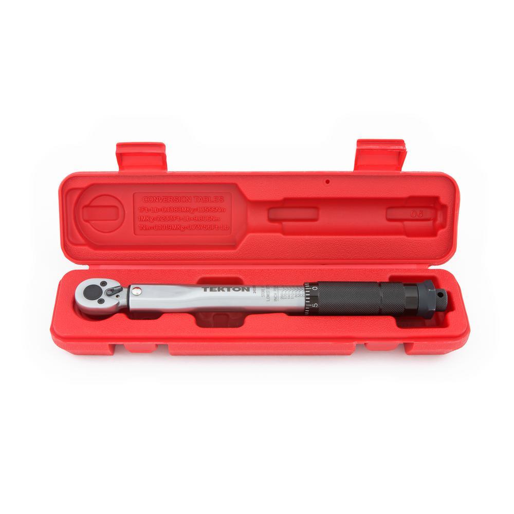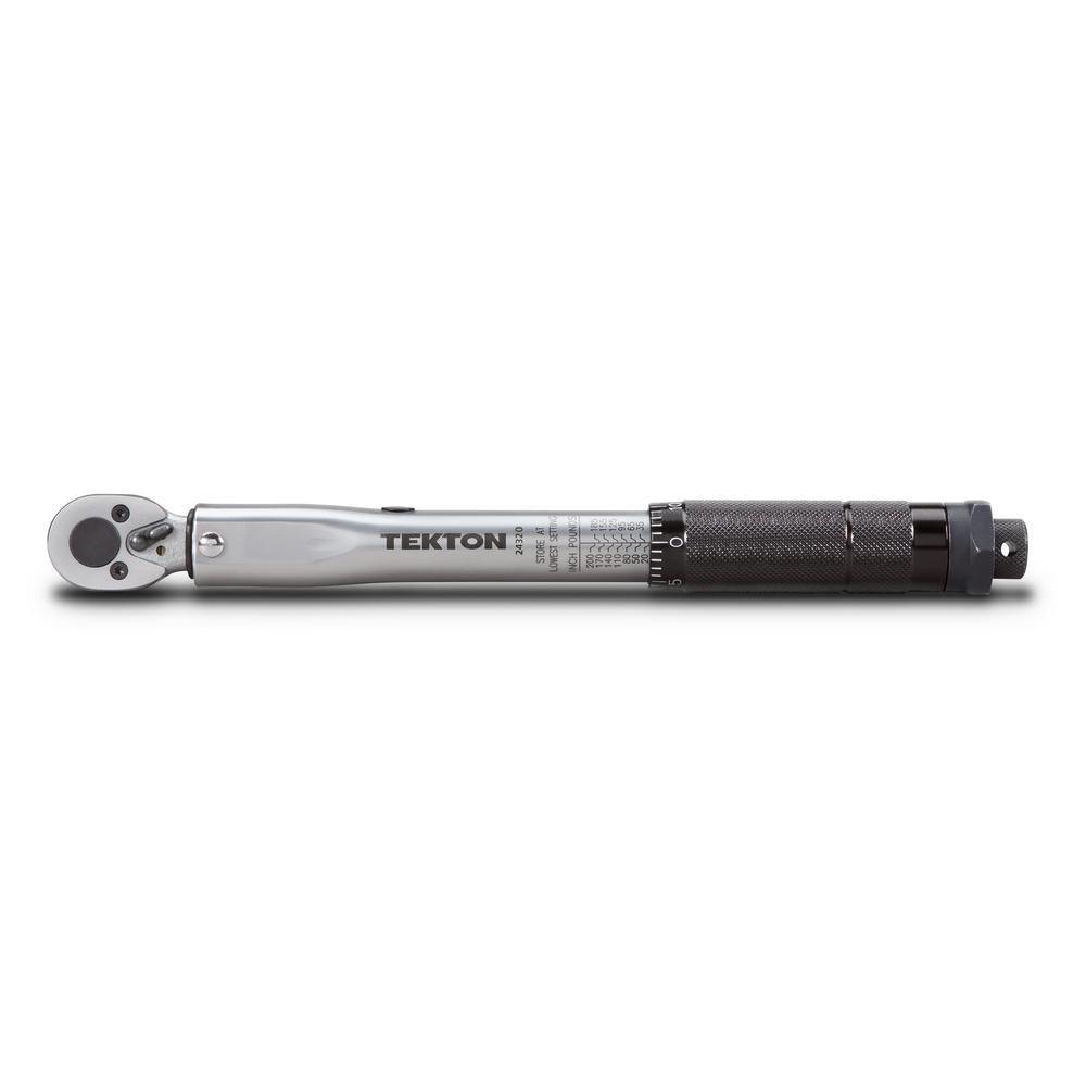 Calibrated to an accuracy of +/- 4%, the TEKTON 1/4 in. Drive Click Torque Wrench lets you work with confidence, eliminating guessing and the common tendency to overtighten fasteners. Correctly tightening fasteners to vehicle or equipment torque specifications ensures parts are properly secured without being damaged. Simple and easy to use, this wrench has a reversible ratcheting head that drives fasteners in both directions and measures torque in the clockwise direction. To measure torque, set the desired value on the handle scale (inch pounds or Newton meters) and begin tightening the fastener. When the preset torque value is reached, a reliable mechanical operation inside the handle produces a click you can hear and feel, alerting you to stop applying force. Built for consistent performance and years of dependable service, the mechanical design does not need batteries and the all-steel construction has no plastic parts to break or wear out. Important: This wrench is shipped pre-calibrated and ready to use. To help maintain calibration, store at its ARB265Wt setting of 20 in./lb. (2.2 Nm) when not in use. Be sure to read and understand the operator's manual, including all safety information, before first use.