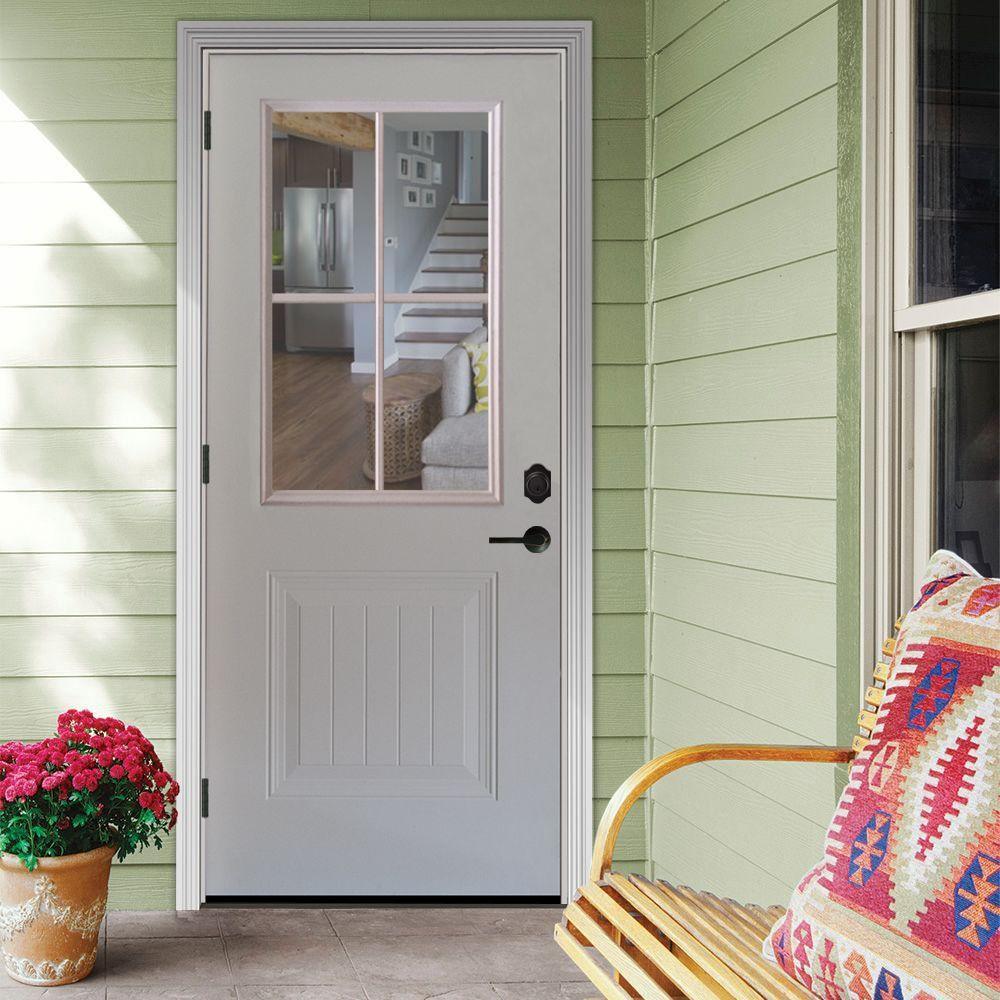 • 1/2-lite plank panel door with four lite external grille adds light and style to your entryway