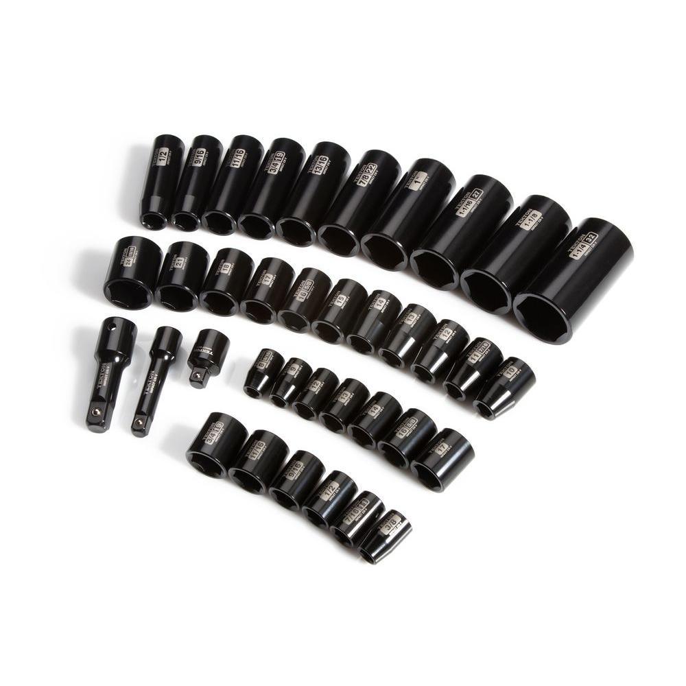 Built for use with impact tools, these TEKTON 3/8 in. and 1/2 in. Drive Deep Impact Sockets effortlessly break free rusty suspension and exhaust bolts, quickly remove stuck lug nuts and loosen crank bolts with ease. TEKTON impact sockets efficiently transfer torque from impact wrench to fastener, loosening the most stubborn nuts and bolts. Made from high-strength chrome vanadium steel, our impact sockets are more resistant to drive end round out than standard impact sockets, resulting in a longer useable life. TEKTON impact sockets meet or exceed ANSI performance standards. The high-torque, 6-point socket grips the broad, flat sides of nuts and bolts, not just the corners, so there is no need to worry about stripping fastener head or damaging socket. An extra-deep broach in the deep sockets enables you to access the entire length of fasteners. Even in low light, the high-contrast, permanent laser etched size markings are easy-to-read. The customized red TEKTON case can be stored in a tool chest or carried to your job site. Molded size markings keeps set organized and identifies any missing sockets.