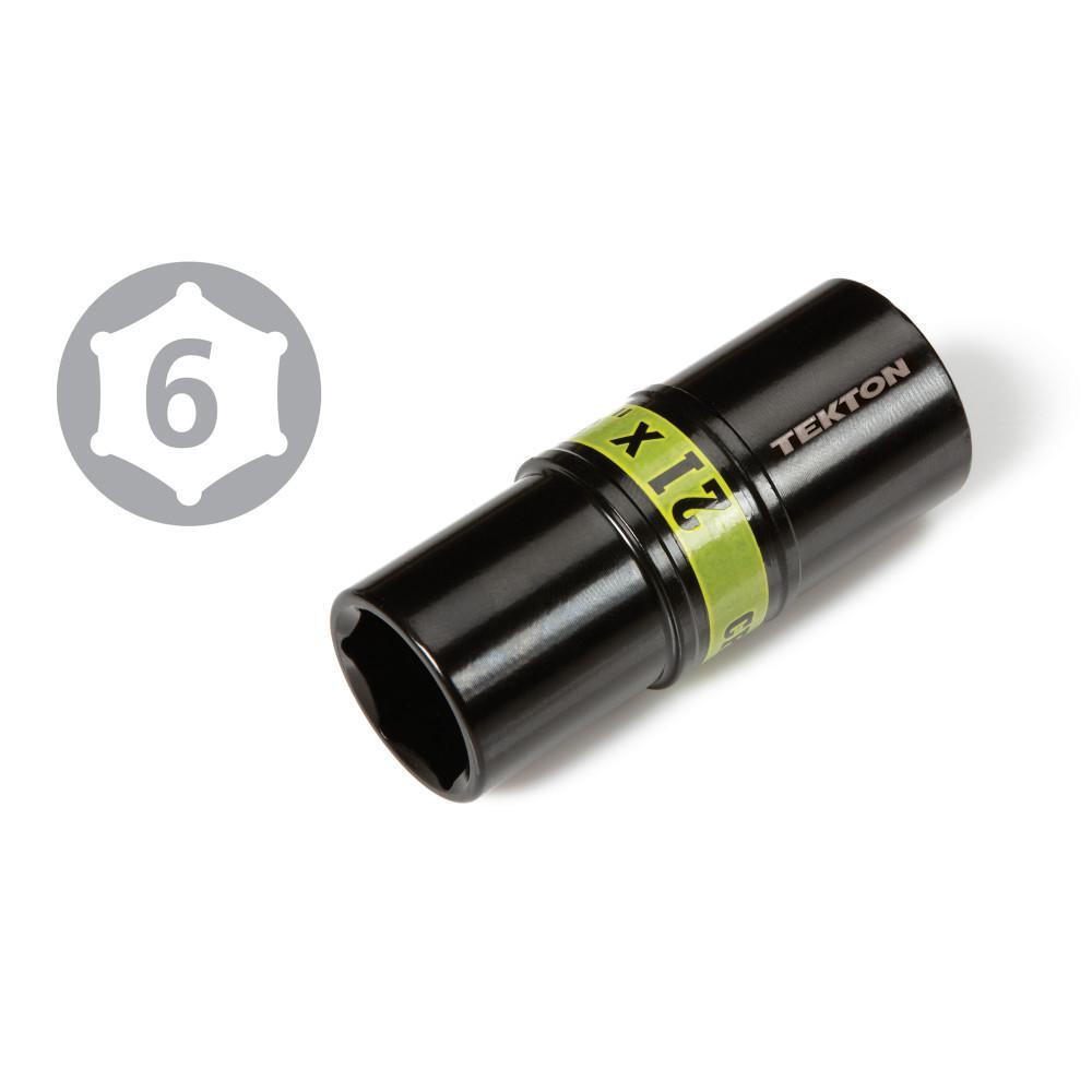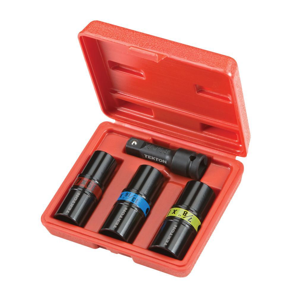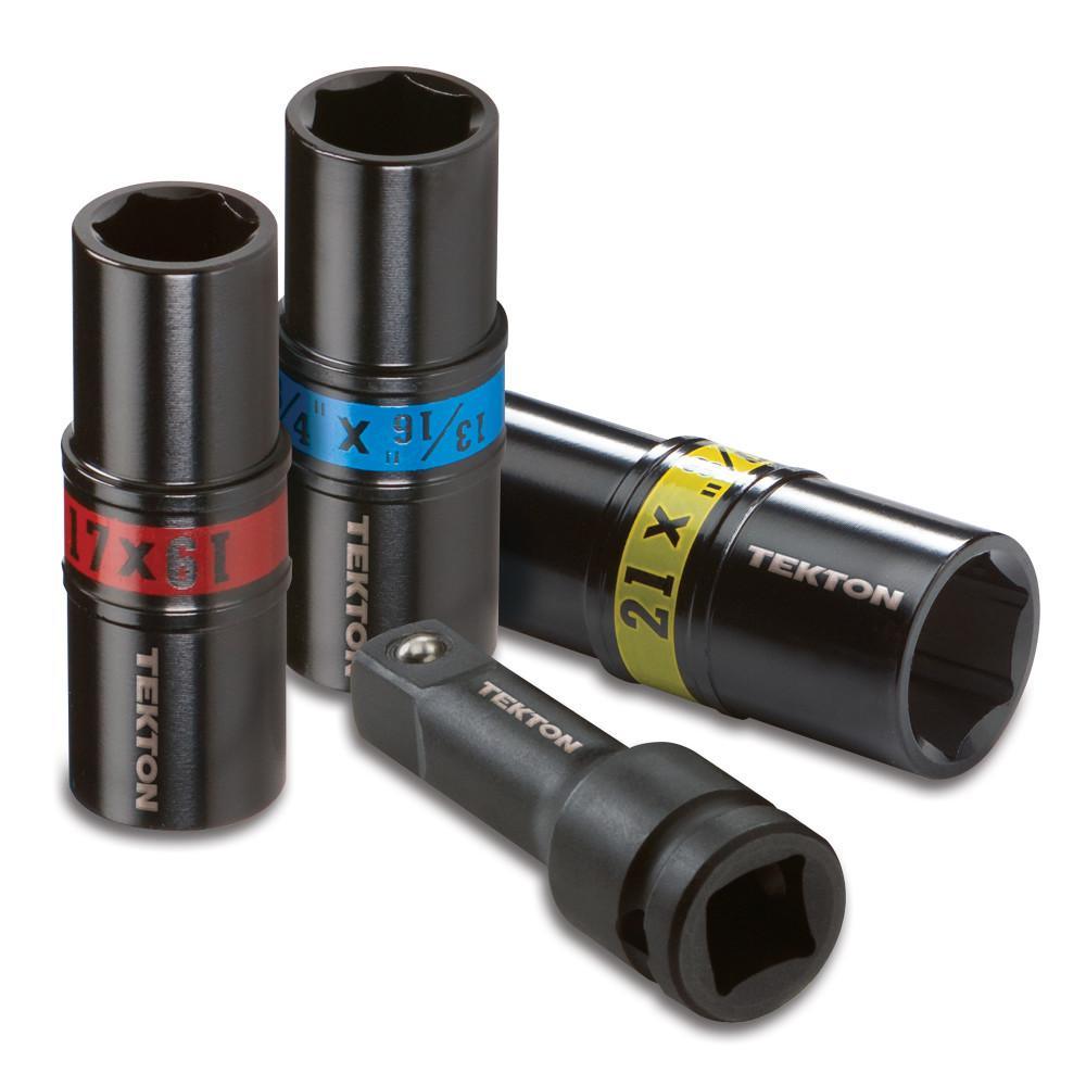 Built for use with impact tools, the TEKTON 4-pc. 1/2 in. Drive Impact Flip Socket Set includes the six most common sizes for lug nuts. The six-point design offers a snug fit and sure contact with the broad, flat sides of a lug nut, not just the corners, preserving its geometry and preventing round-off. Thinner walls give sockets the clearance to slide into tight recessed wells where many other impact sockets can't go. Made of forged and hardened chrome molybdenum steel, each socket has a durable black electroplated finish. Color coding allows for quick size identification.
