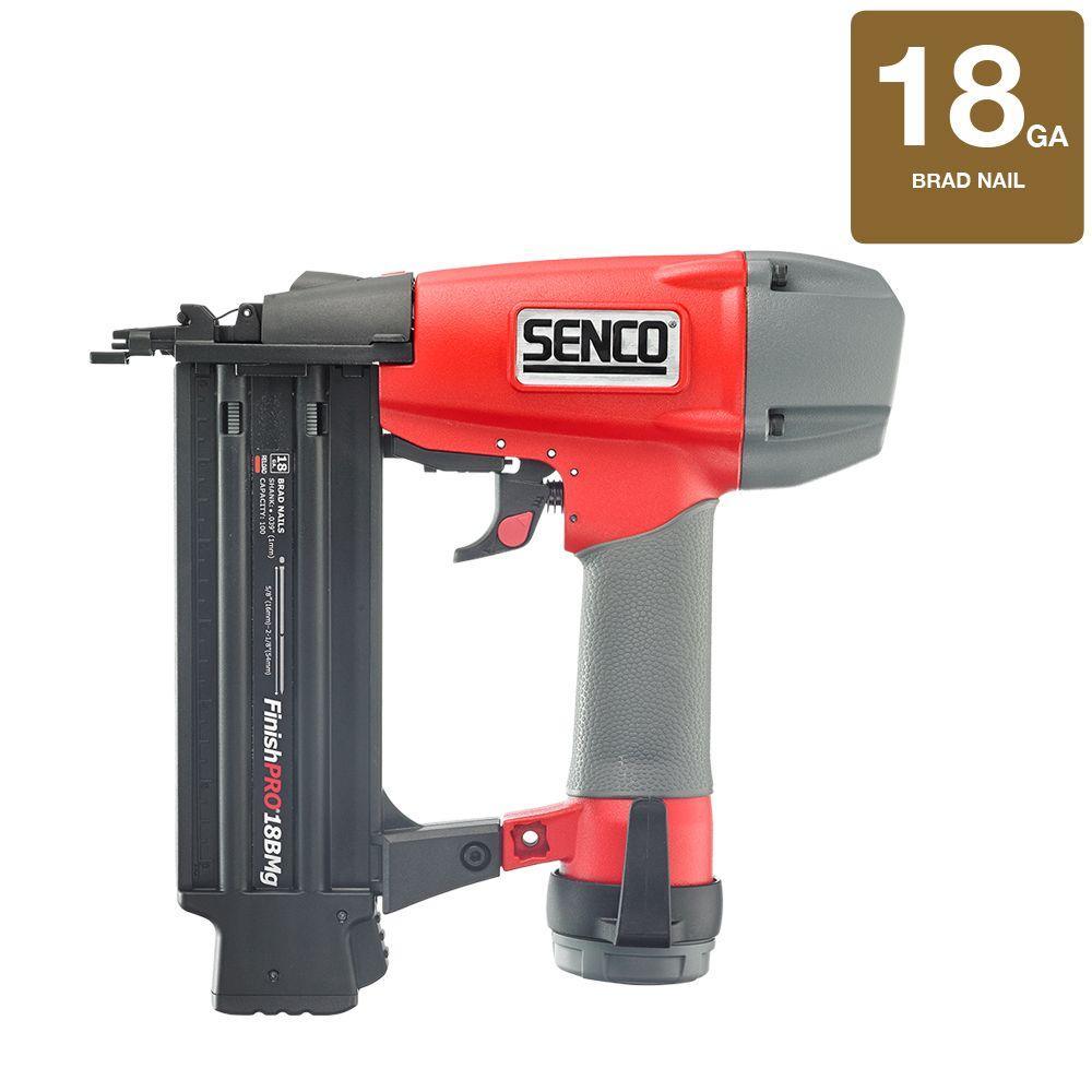 Senco's FinishPro 18BMg is a full length 2-1/8 in. 18-Gauge brad nailer. It is designed to be extremely lightweight with a magnesium body, virtually maintenance free with its oil-free operation and is equipped with a nose mounted LED light to help illuminate dark work spaces. Additional features include a rotatable exhaust, rotatable belt hook, tool free depth of drive and a selectable trigger.