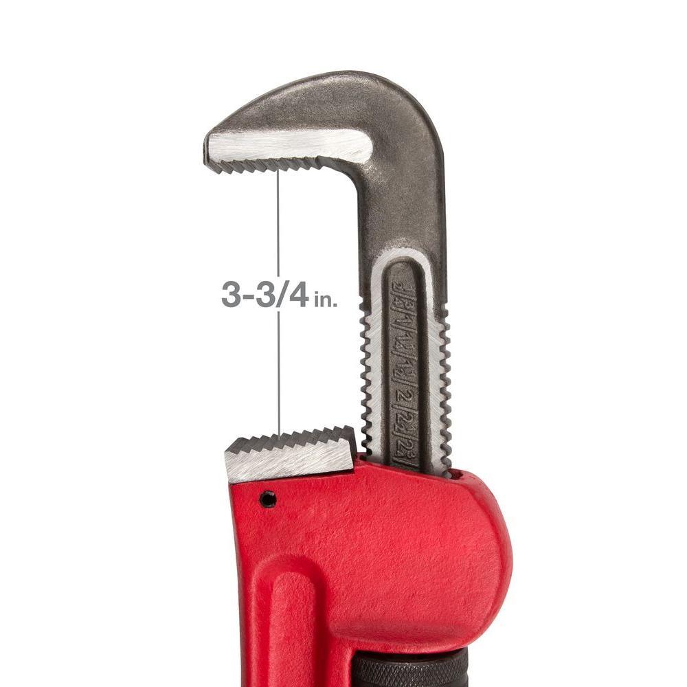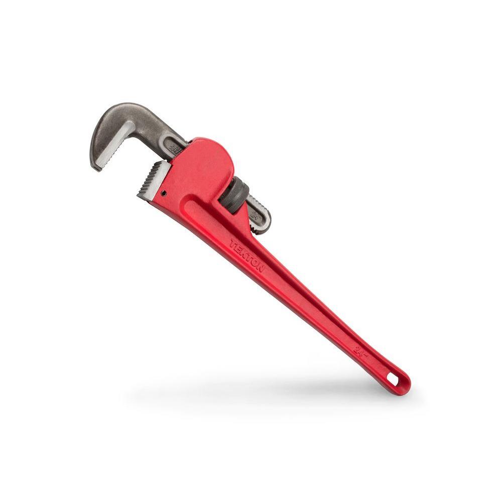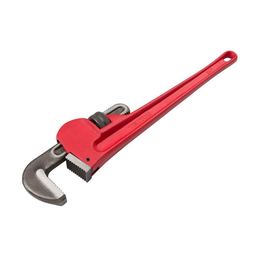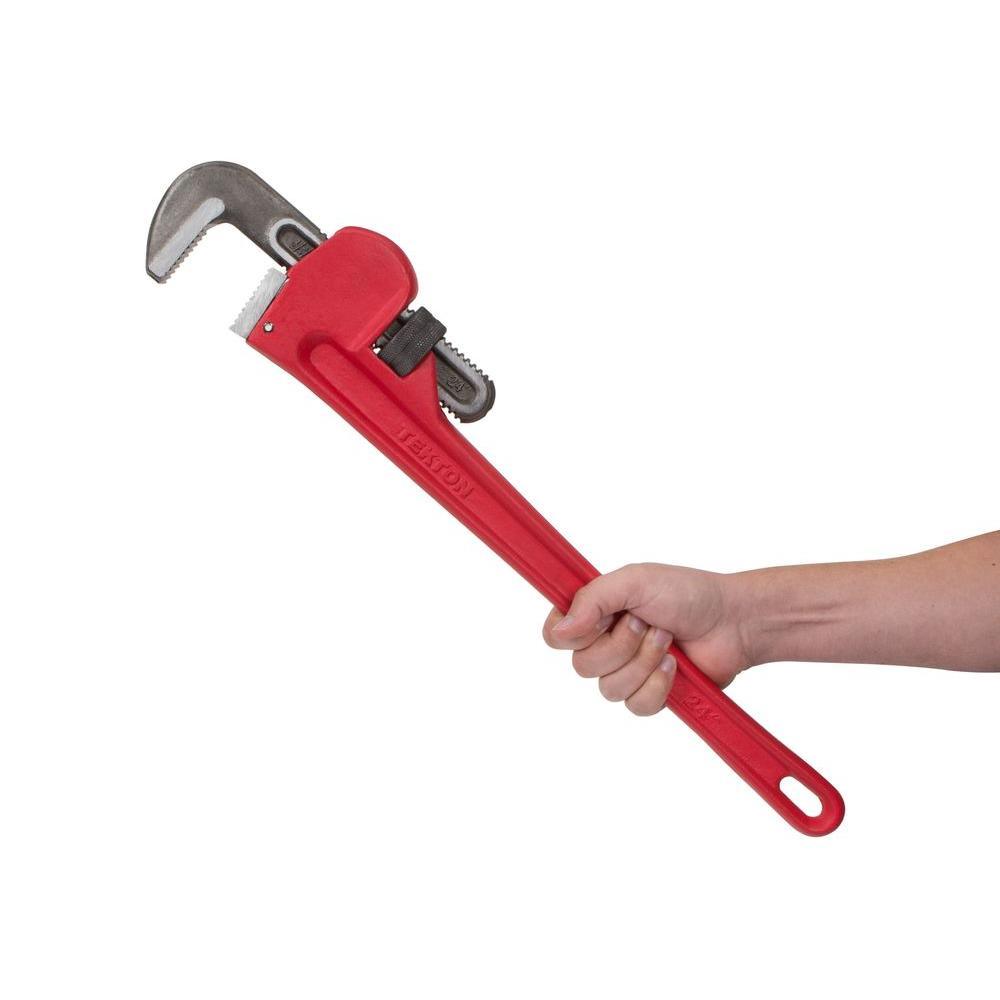 Grip and turn pipes and fittings up to 3-3/4 in. O.D. with the TEKTON 24 in. Pipe Wrench. The forged and hardened hook jaw floats on spring suspension, creating a continuous, grip-and-release ratchet action with very short swing arc, making it ideal for tight work spaces. Deep, precisely-machined teeth offer a secure, non-slip grip, even on the smooth surfaces of round pipes. For sure strength, the cast iron body and handle is made as a single piece. Designed like an I-beam, the handle resists bending and has a wide, rounded profile to keep your hand comfortable.