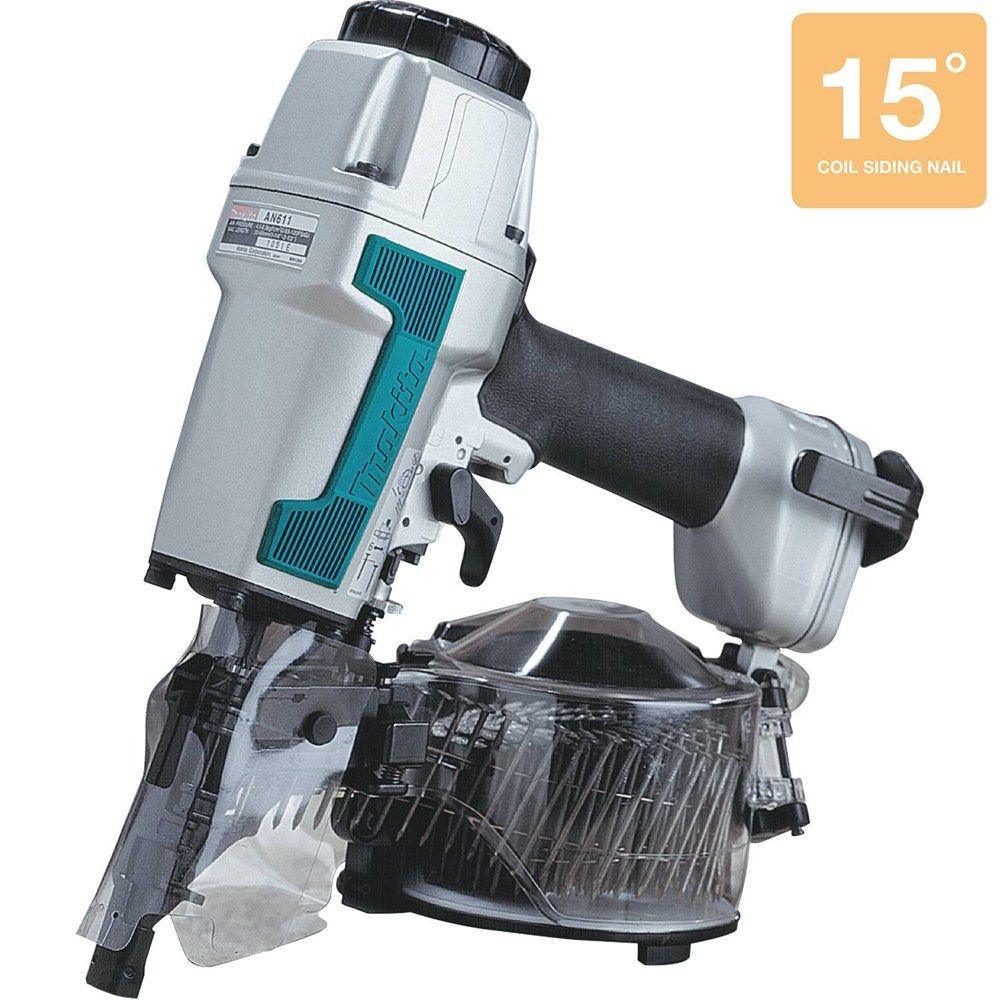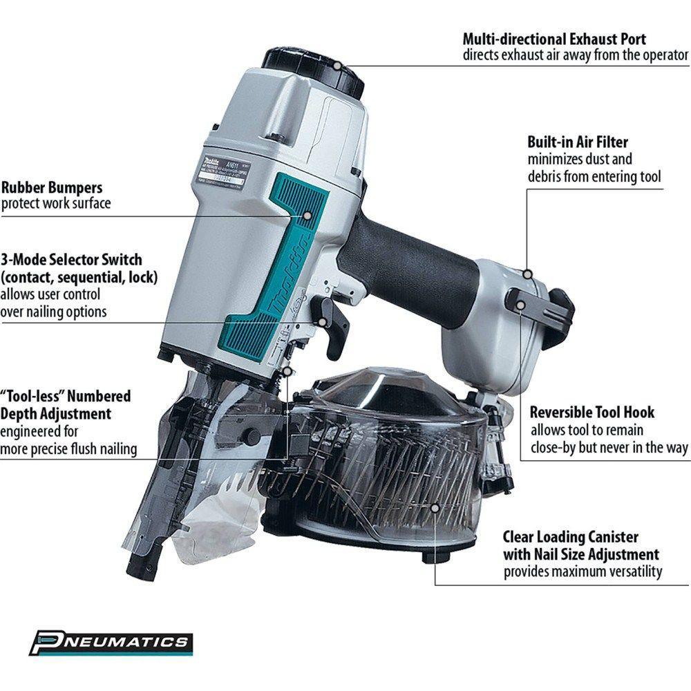 The Makita 2-1/2 in. Siding Coil Nailer combines rugged construction with ease-of-use features for improved performance. The Makita 2-1/2 in. Siding Coil Nailer accepts 1-1/4 in. to 2-1/2 in. nails (.080 - .099 shank diameter) with a 300-400 magazine capacity and an easy-loading canister with nail size adjustment. The Makita 2-1/2 in. Siding Coil Nailer has a 3-mode selector switch (contact, sequential, lock) that is engineered for increased user control and convenience. Additional features include a "tool-less" depth adjustment with 9 depth settings and sharp spurs that grip the wood for increased control at an angle.