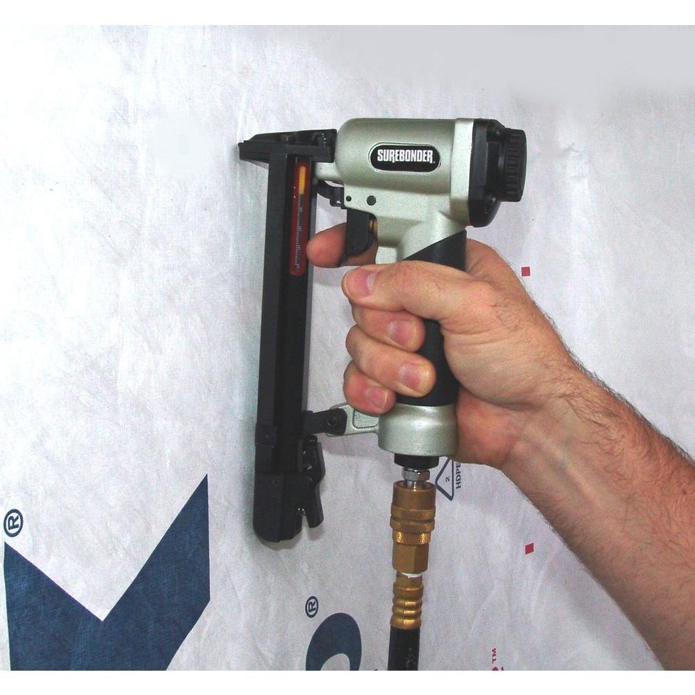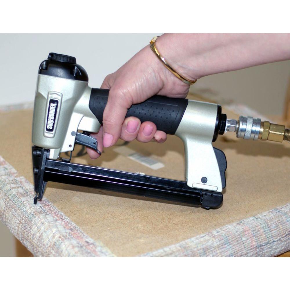 Lightweight, effortless and user friendly will make this the perfect tool for all of your stapling needs. You will receive 1250 staples of each different length: 1/4 in., 5/16 in., 3/8 in., 1/2 in. and 9/16 in. These are Surebonder # 4 standard size staples, same as Arrow T50 type staples. The kit also includes a high impact carrying case, an Allen wrench, small bottle of tool oil and operating instructions. The applications are endless and we're sure you will add to the list once you realize the ease of this staple gun. Upholstery, insulation, screen repair, crafts, general repairs, boat vinyl repairs or replacement, wood projects, fencing repairs. The gun has many attractive standard features such as: a safety mechanism that prevents accidental firing, an adjustable air exhaust and a rubber cushioned handle for comfort, a quick release magazine for easy staple loading, staple viewer and 1/4 in. male quick release connector (Air Compressor Not Included).