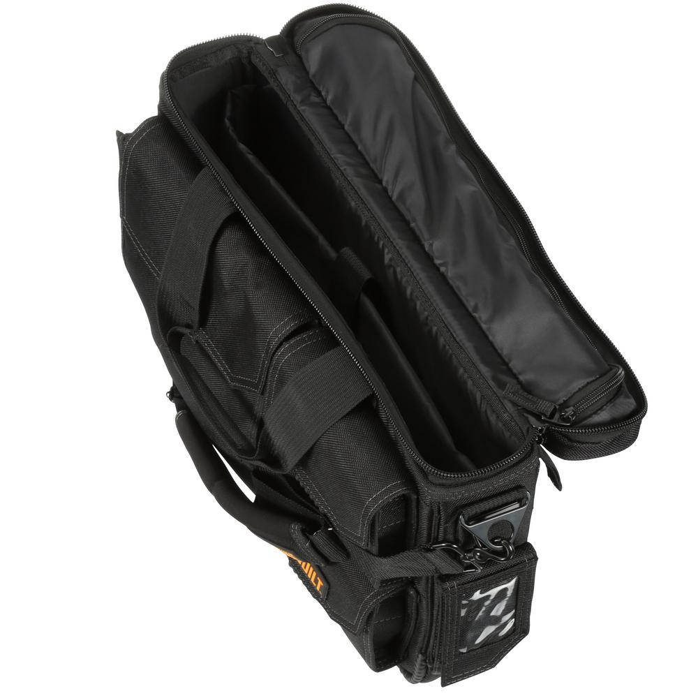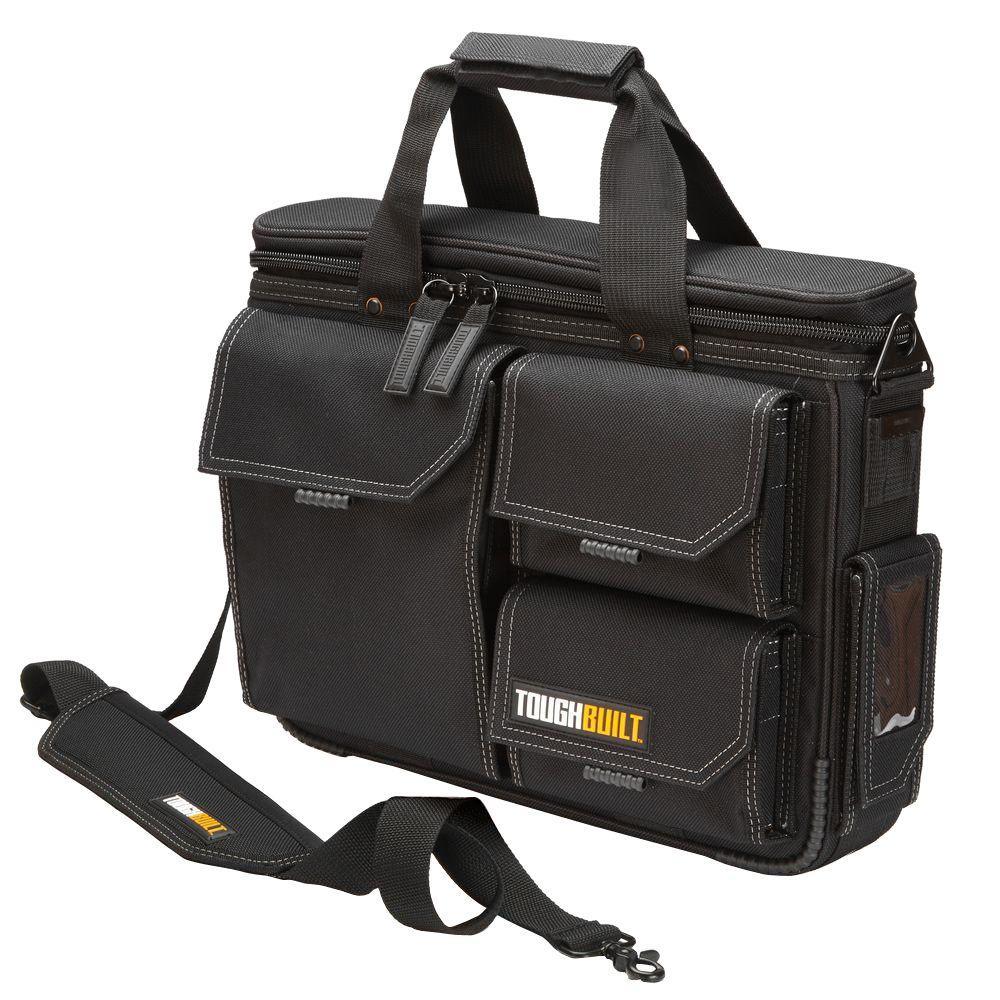 The TOUGHBUILT Quick Access Laptop Bag and Shoulder Strap (Medium) is designed to organize and protect your 13 in. - 17 in. laptop and accessories in the field. Rugged HardBody construction is combined with thick padding to make sure everything stays safe. Unique exterior pockets allow quick access to everything you carry. The largest pocket is padded and a perfect fit for the iPad Organizer and Grid Notebook (TB-56-IP-C) or TOUGHBUILT Organizer and Grid Notebook (TB-56-L-C). The zippered lid reveals a padded laptop pocket file dividers. Under the lid is an additional accessory pocket for smaller items. Also includes and tape measure clip and business card pocket. By adding a patented ClipTech Hub to the side, professionals have the never-before-seen option of effortlessly clipping 1 of the many TOUGHBUILT tool pouches from the bag to belt to fit every job.