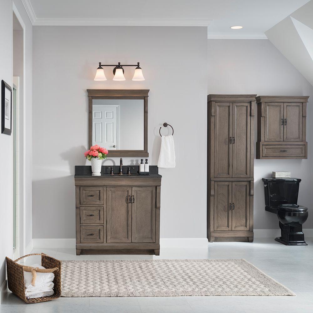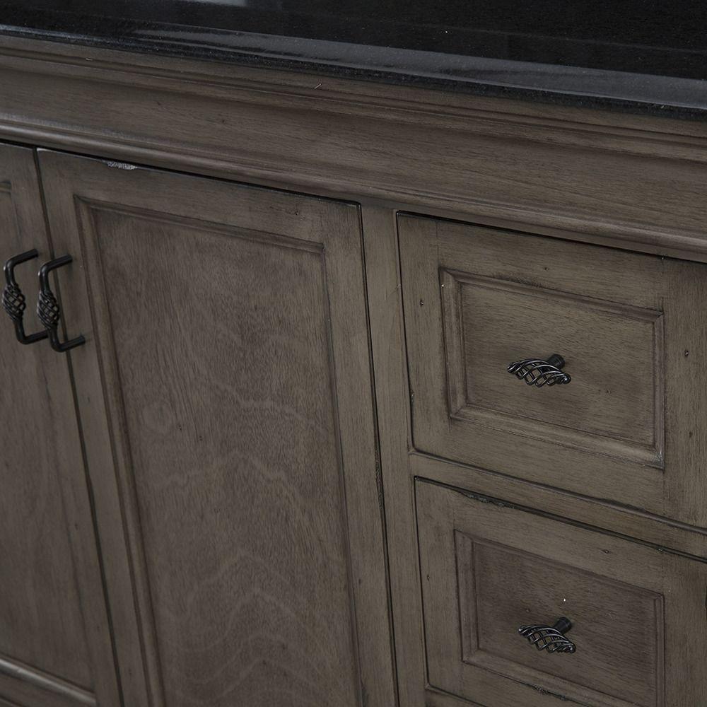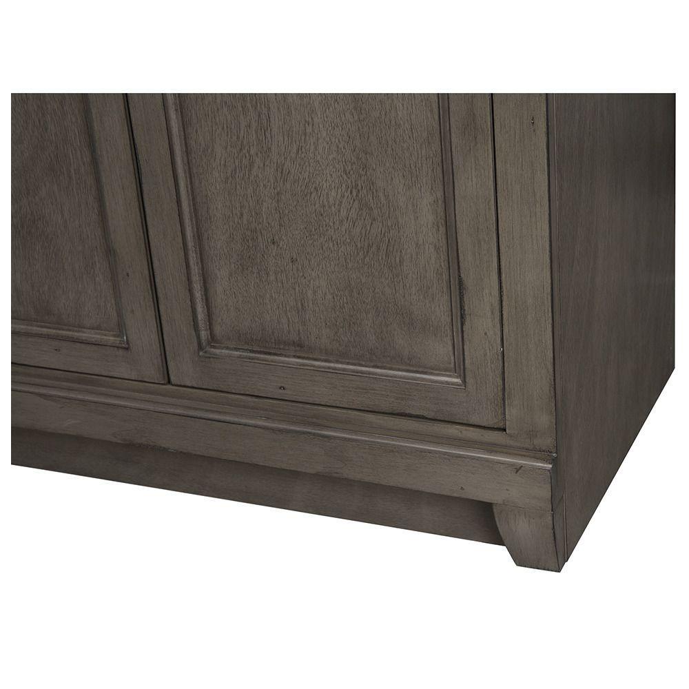 Enveloped in a Distressed Grey finish and accented with black birdcage-style hardware. This fully-assembled, 36 in. vanity features a unique design. Its 3 full-extension drawers are on the left side, providing ample storage space. Behind its 2 beautiful doors on the right lies an even larger storage area that's perfect for stacks of towels and a wide array of bath, skincare and household items. Crafted only with durable woods and designed to accommodate a single centerset basin. (Not included).