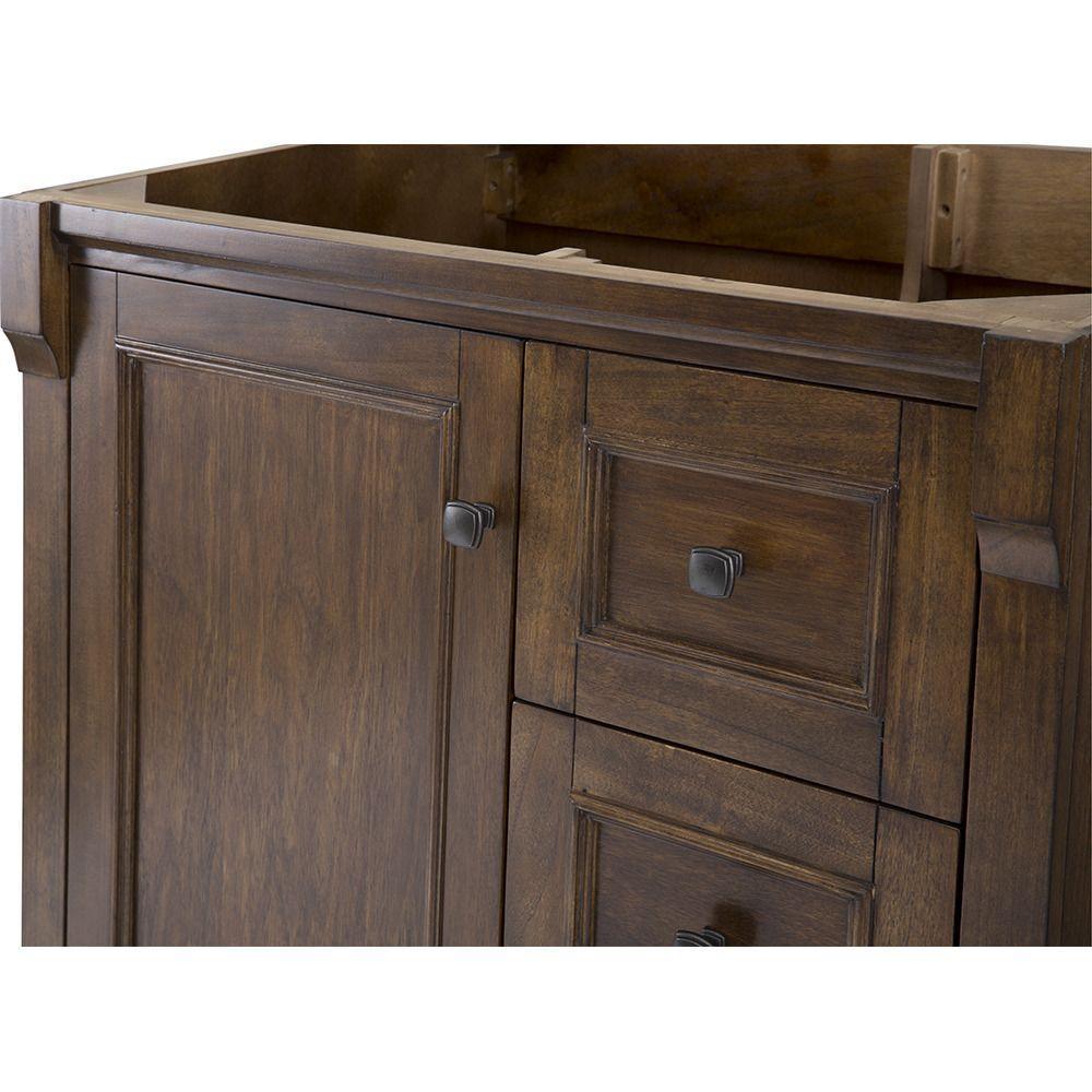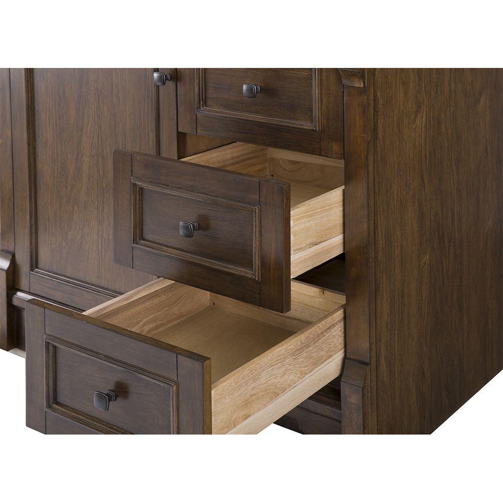 Add a bit of rustic charm with a splash of contemporary with the Creedmoor 36 in. vanity, the perfect addition to any bathroom. The Creedmoor vanity helps make the most of your valuable space in a stylish way with a large interior cabinet behind a framed panel door, as well as two slow closing drawers. Finished in a gorgeous walnut with a curved toe kick and squared oil rubbed black knobs, this Creedmoor Collection vanity will absolutely impress all that see it.