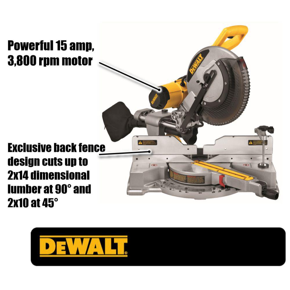 The DEWALT DWS709 miter saw is designed with a powerful 15 Amp, 3800 RPM motor that delivers exceptional power and durability. A tall sliding fence supports crown molding up to 5-1/2 in. nested and base molding up to 4-1/2 in. vertically against the fence while easily sliding out of the way for bevel cuts. This saw features an exclusive back fence design that cuts up to 2 in. x 14 in. dimensional lumbers at 90 degrees and 2 in. x 10 in. at 45 degrees.