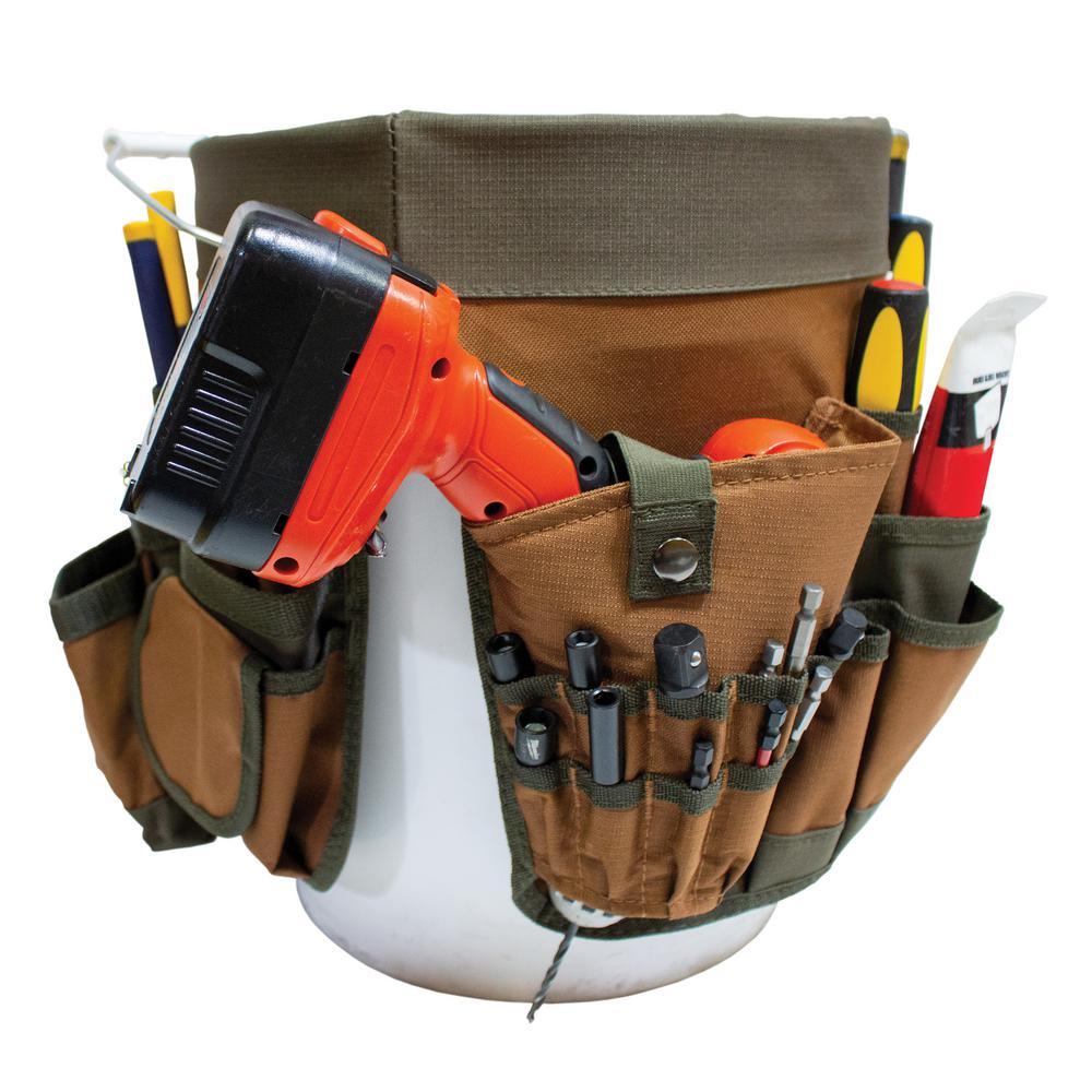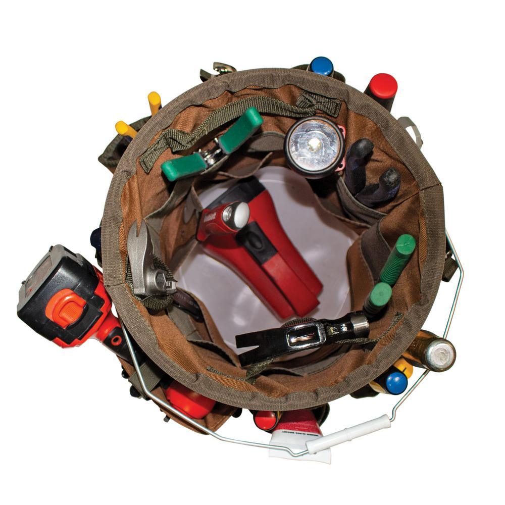The Bucket Boss 56-Pocket Bucket Tool Organizer gives you the ability to hold plenty of your hand tools in a 5 Gal. bucket. Made of durable poly ripstop/600D poly material and built with 48 exterior and 18 interior pockets, fits any 5 Gal. bucket. There are also 3 interior loops for hammers, drills, pry bars and long tools. Bucket is not included.