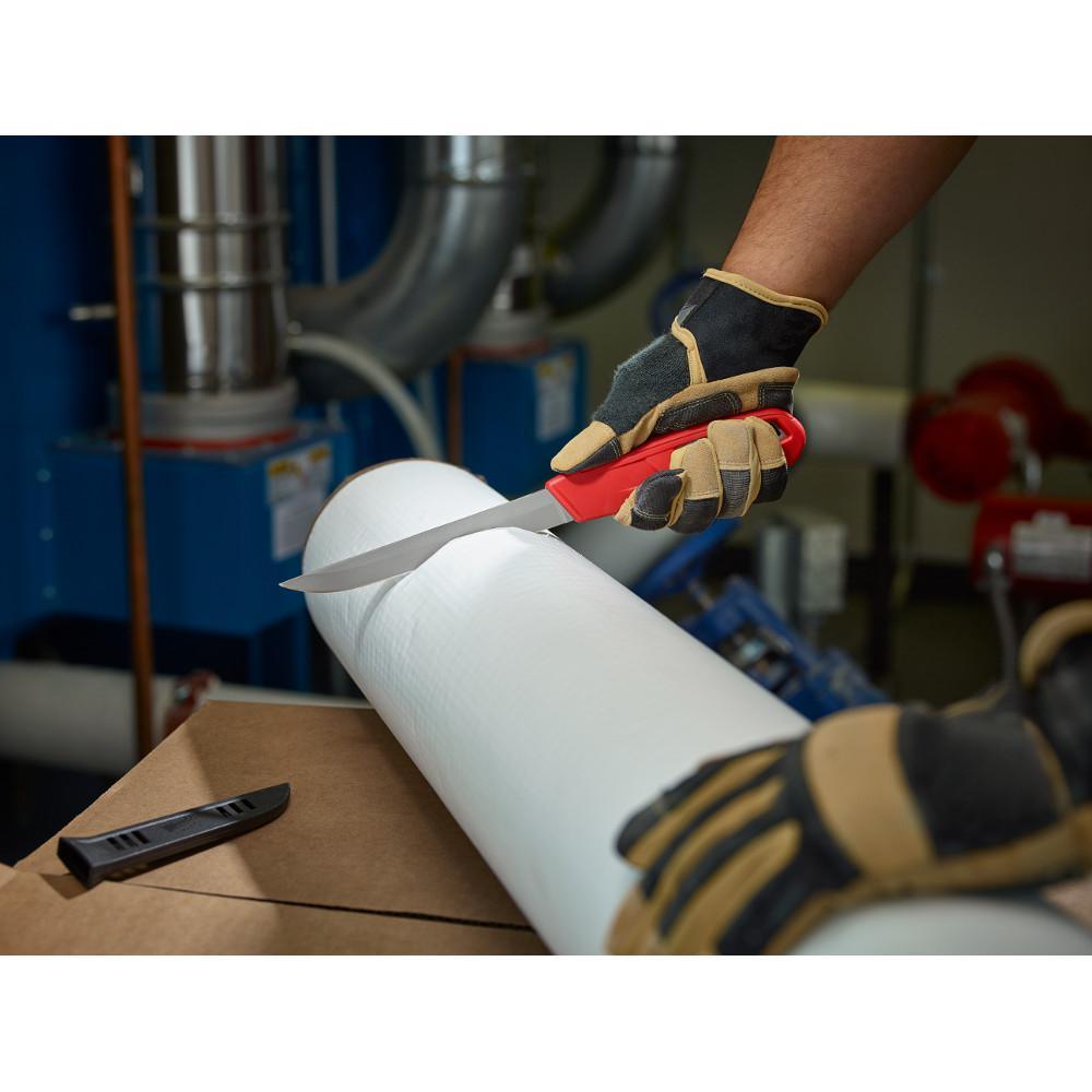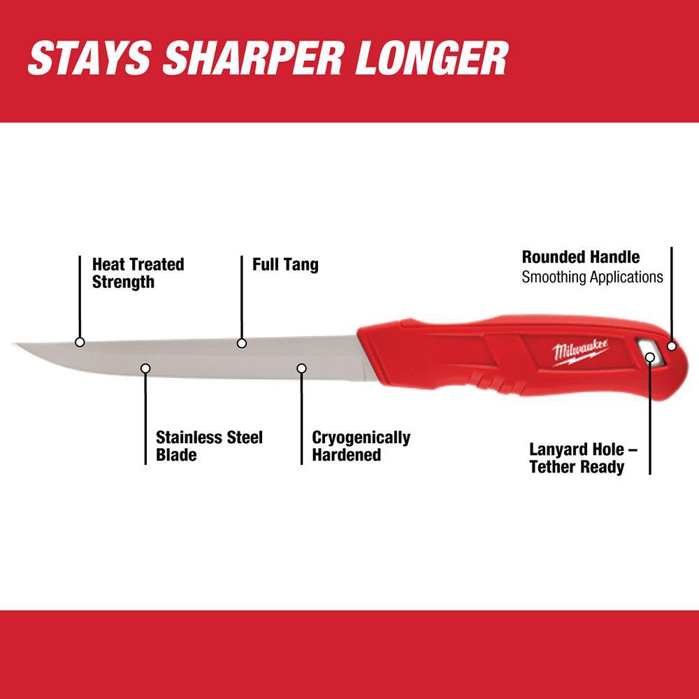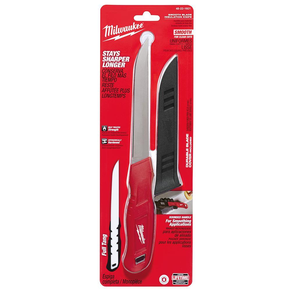 The Milwaukee Smooth Blade Insulation Knife is designed for optimal edge retention and durability. The stainless steel blade is engineered to stay sharper up to 2X longer when cutting mechanical and HVAC insulation. A full metal tang provides durability for tough cuts and the rounded handle allows for smoothing tapes and adhesive laps.