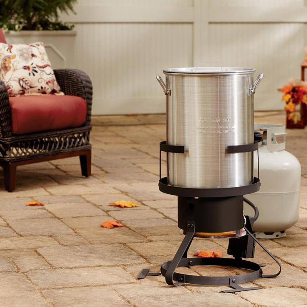 The RiverGrille 30 Qt. Turkey Fryer comes with a 12 in. D fry thermometer and a turkey stand with hook. The timer will automatically shut off the gas flow to prevent overheating. Tip guards will prevent the fryer from tipping off the stand. The fryer is certified to the latest CSA testing standards.