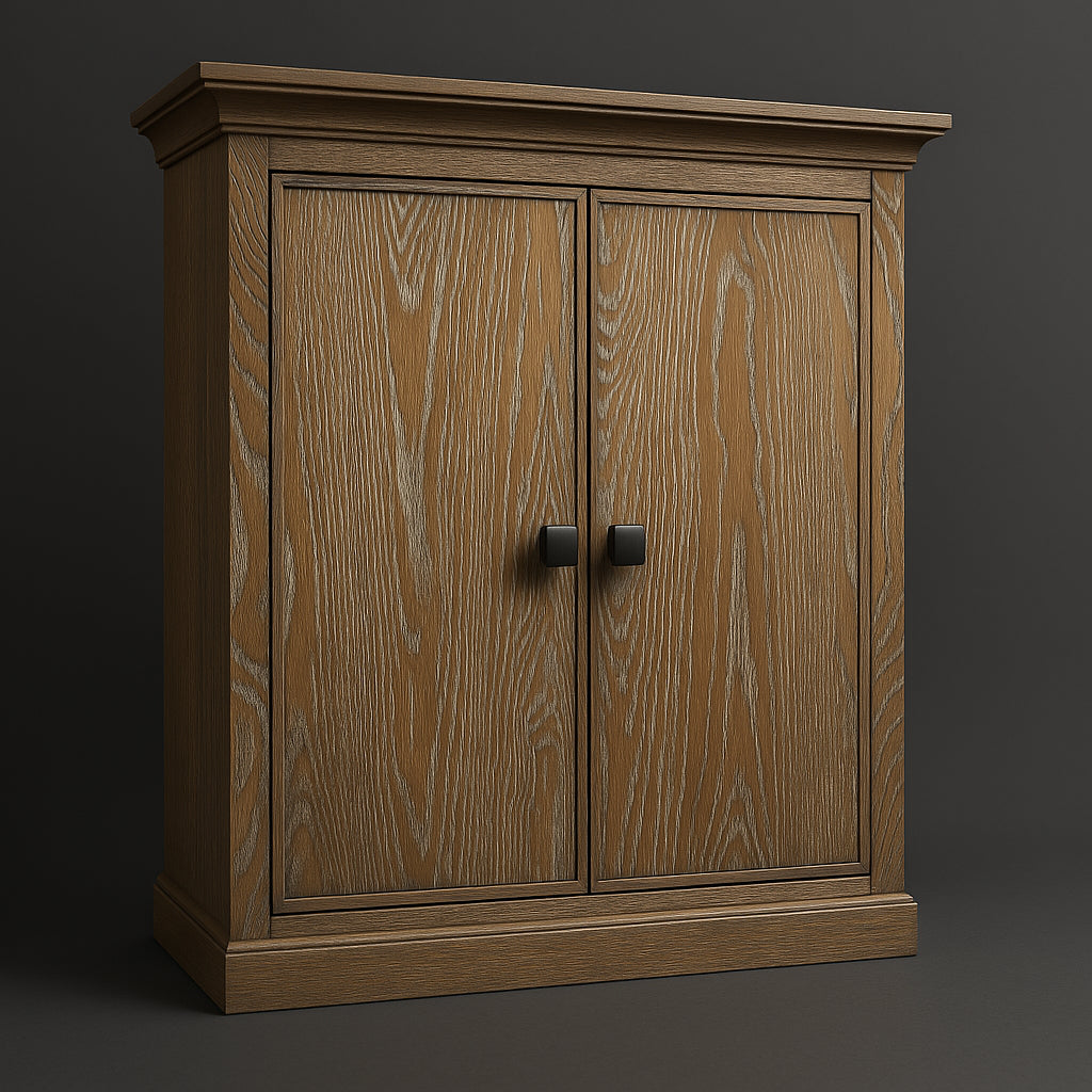 - Elegant Design: Weathered grey oak finish with antique bronze hardware.