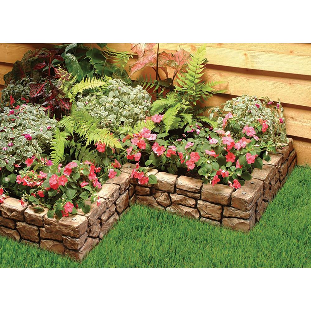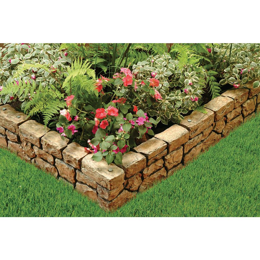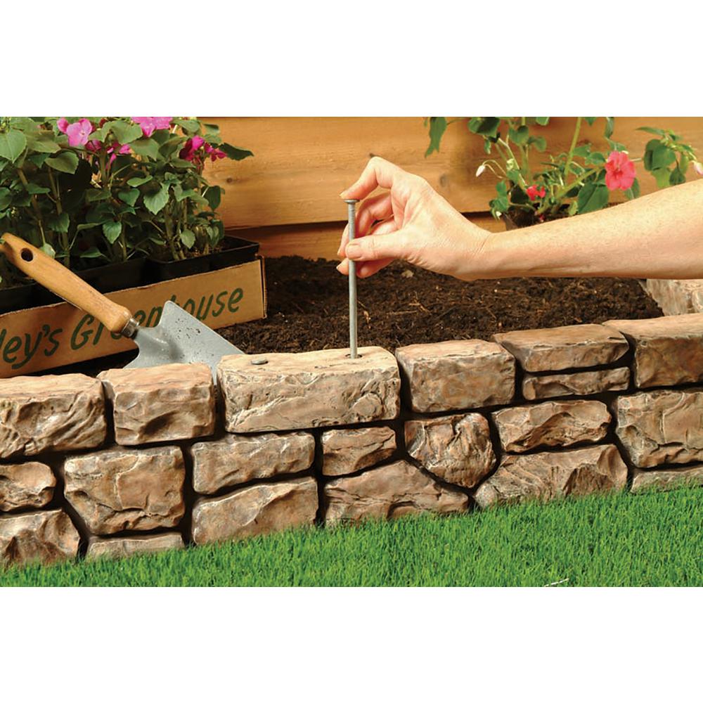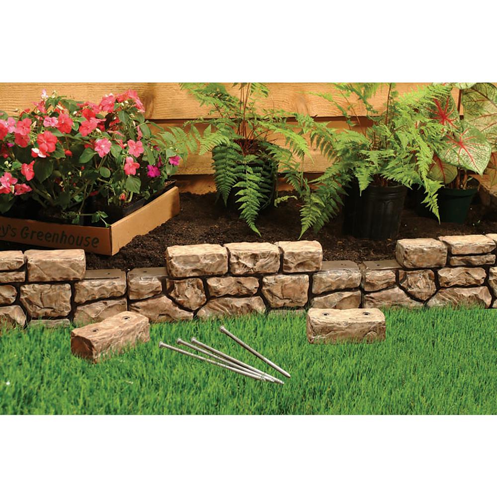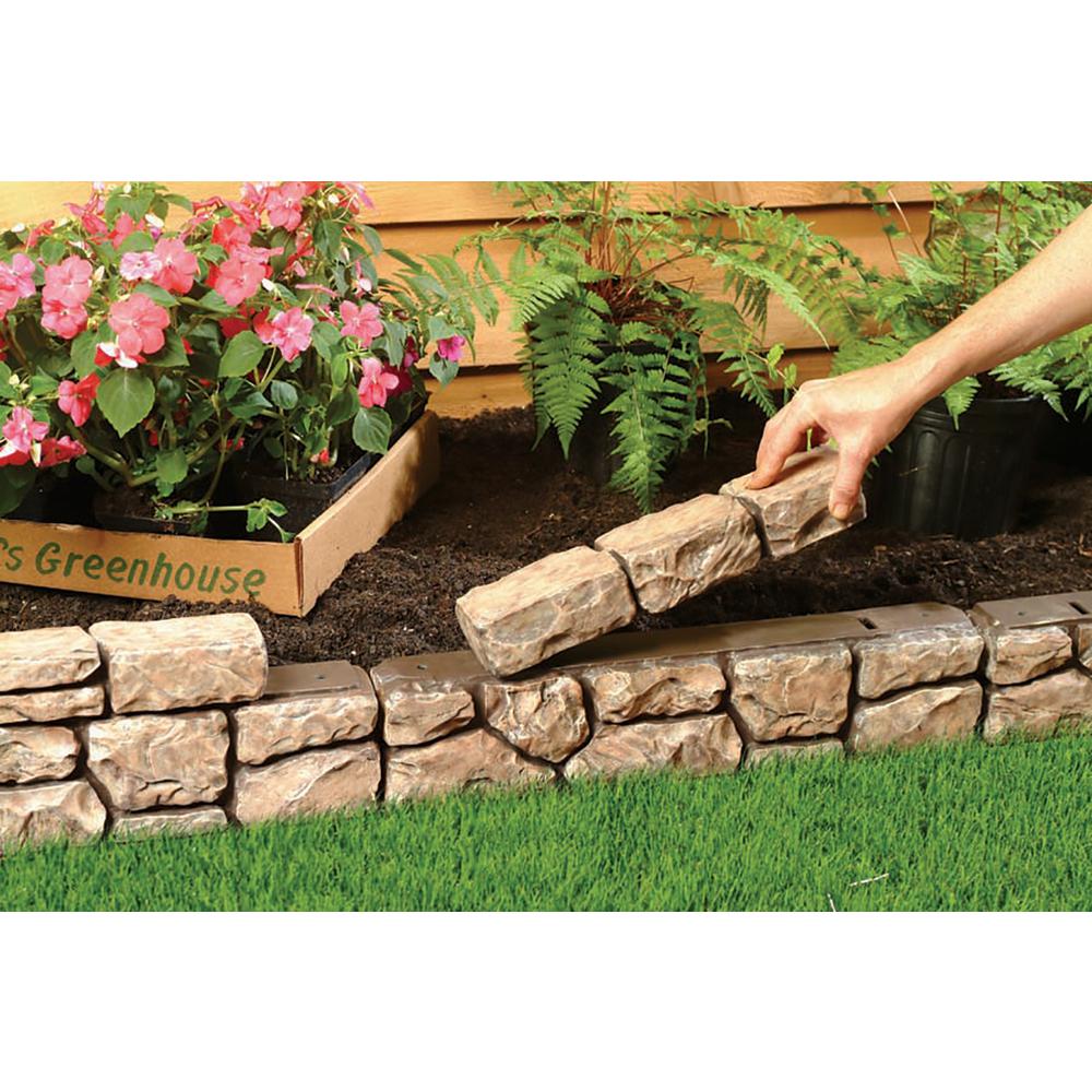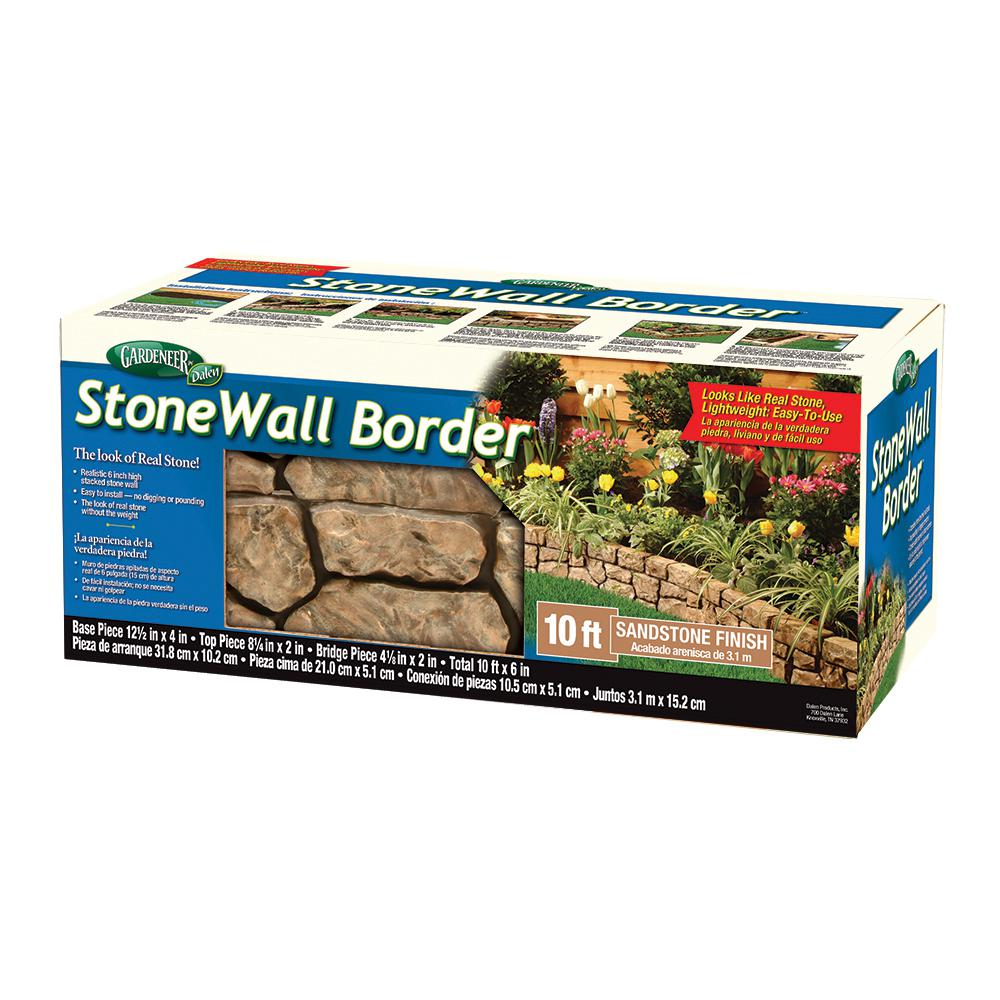 Stone wall Border is easy-to-install with no digging or pounding required. Realistic, 3-dimensional stacked stone is a tan color 6 in. high and 10 ft. long. Due to the nature of the hand-painting process, color variation will occur.